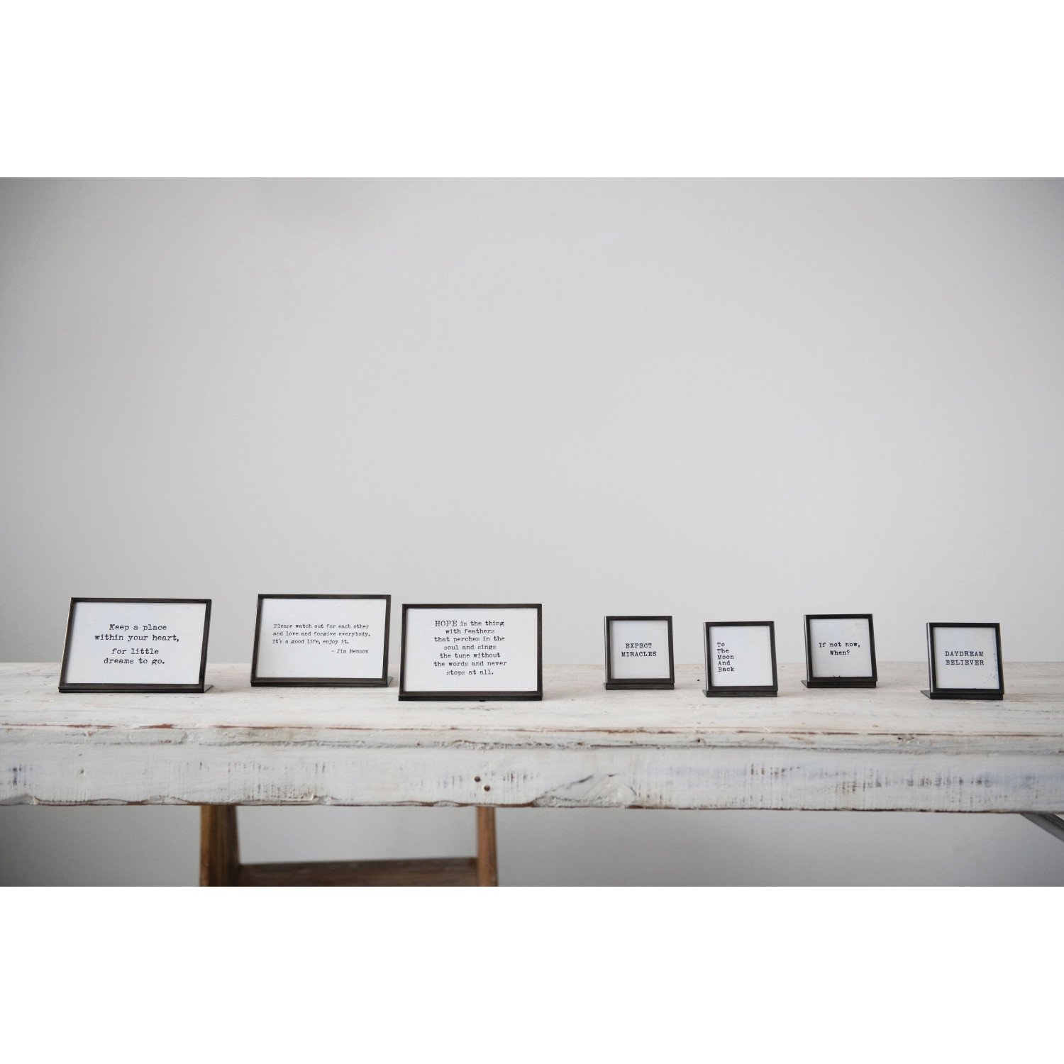 This sophisticated metal and glass frame with easel and saying is an engaging and uplifting accent piece. It is a thought-provoking and simple accent piece that will look great in any room in the home or office and easily incorporates into a wide range of styles. Place as a stand-alone piece or mix with a complimentary grouping for an engaging display. Holds 3" square photo. Comes in 4 styles.