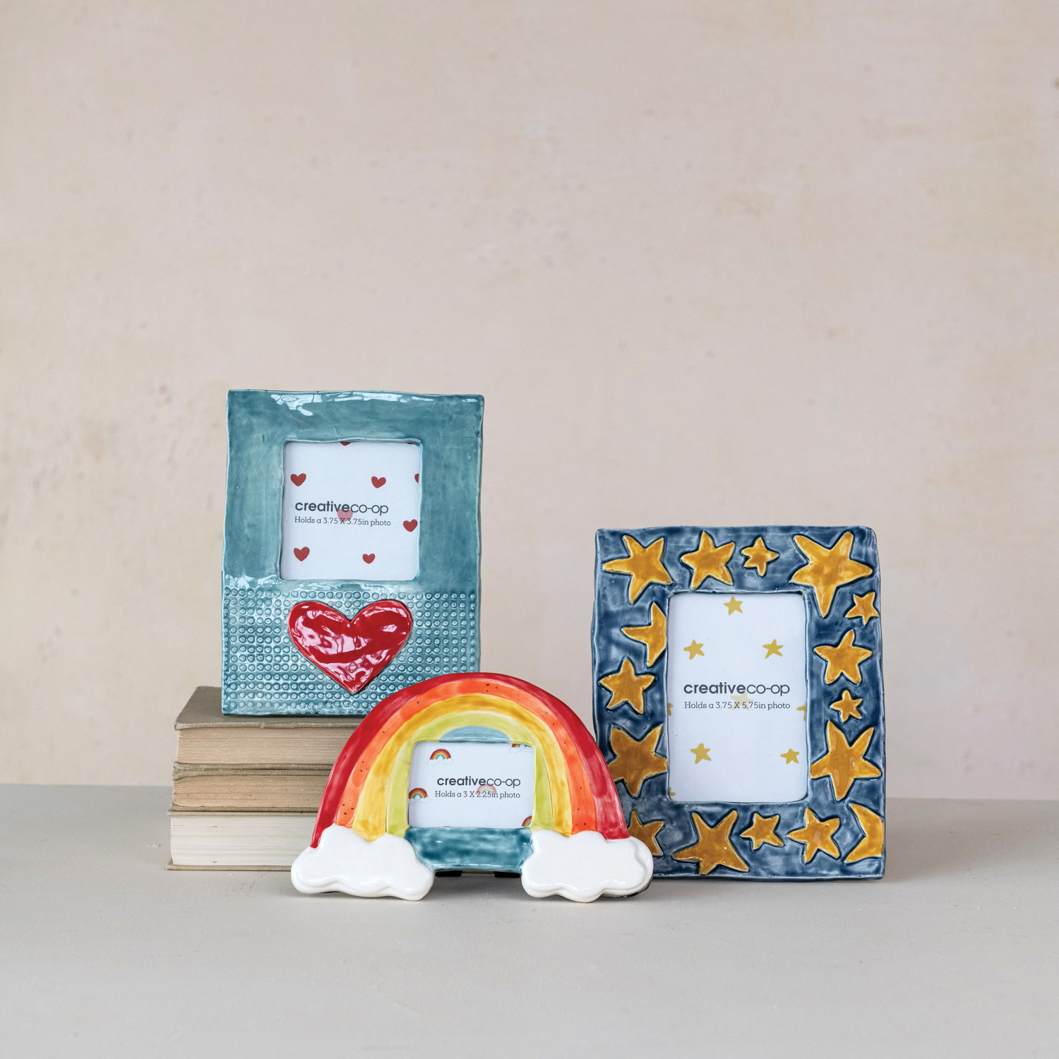 Catalog Name: 5-1/4"W x 8-1/4"H Handmade Stoneware Rainbow Shaped Photo Frame, Multi Color (Holds 3" x 2-1/4" Photo) ©