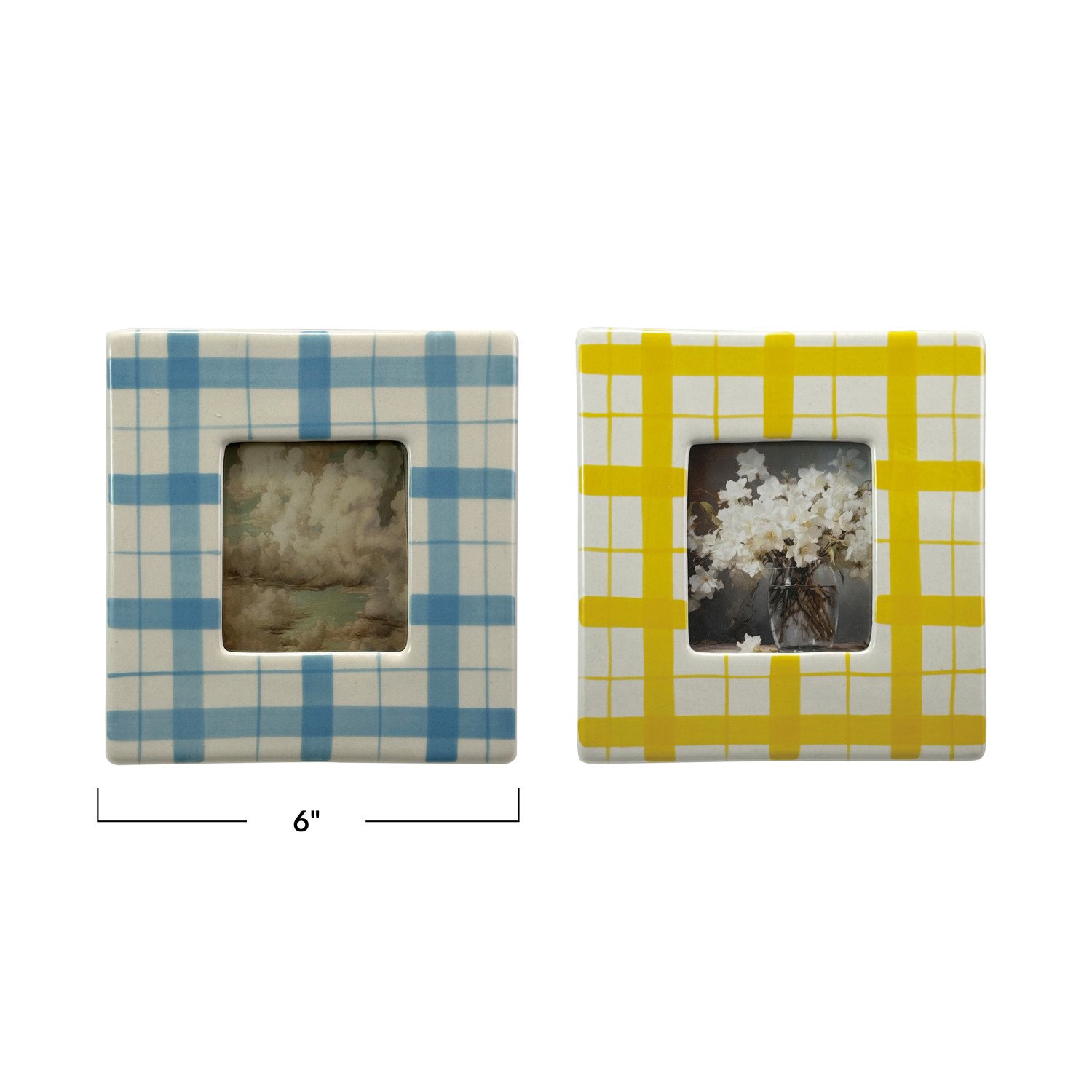 Catalog Name: 6" Square Hand-Painted Stoneware Photo Frame w/ Plaid Pattern, 2 Colors (Holds 3" x 3" Photo) (Hangs or Sits)