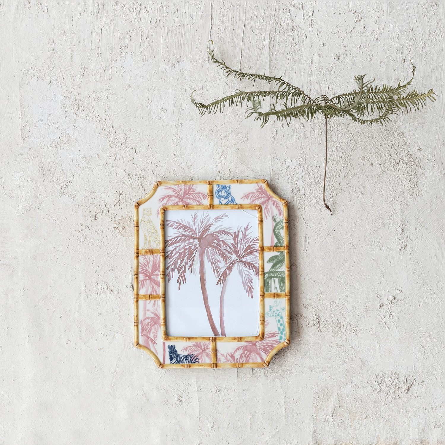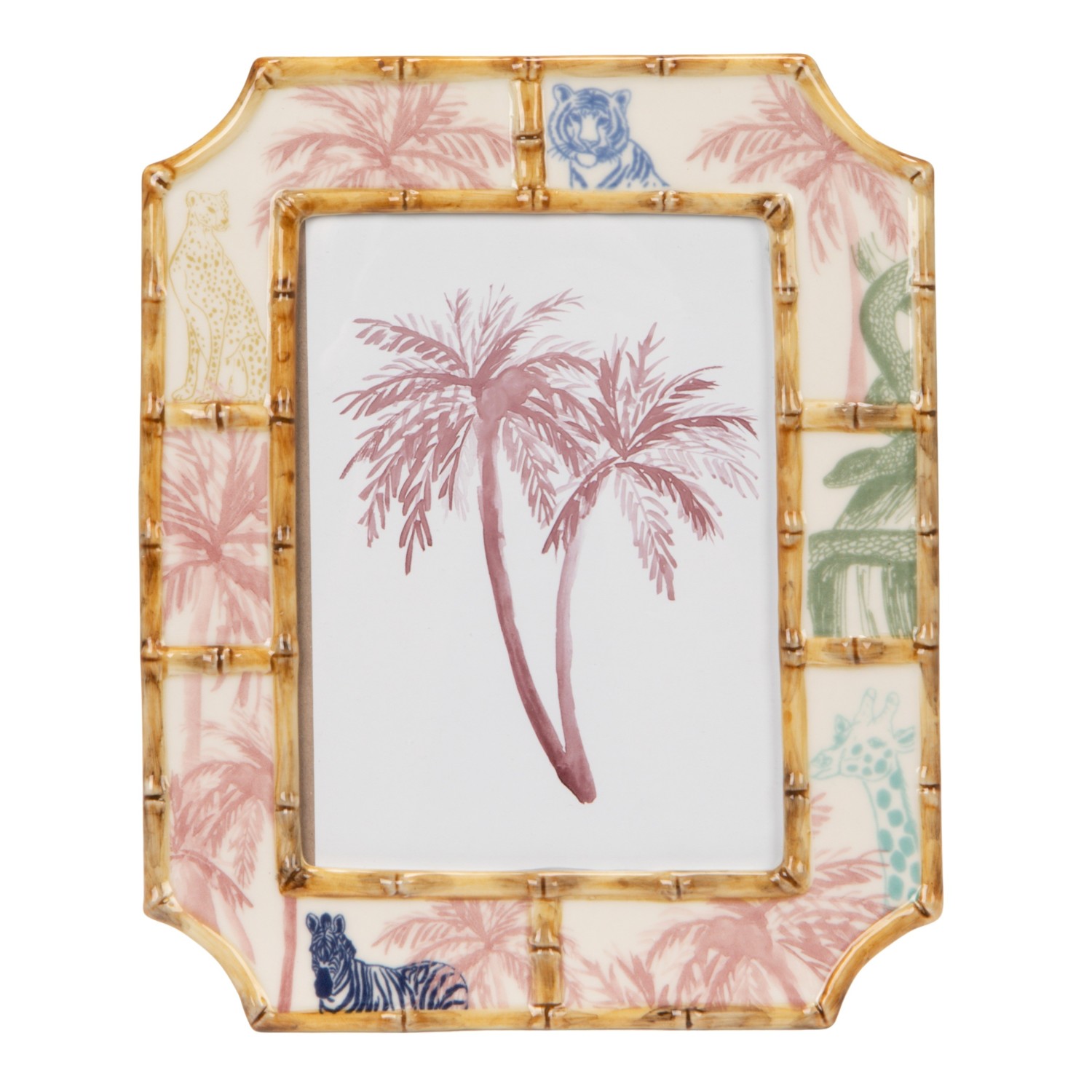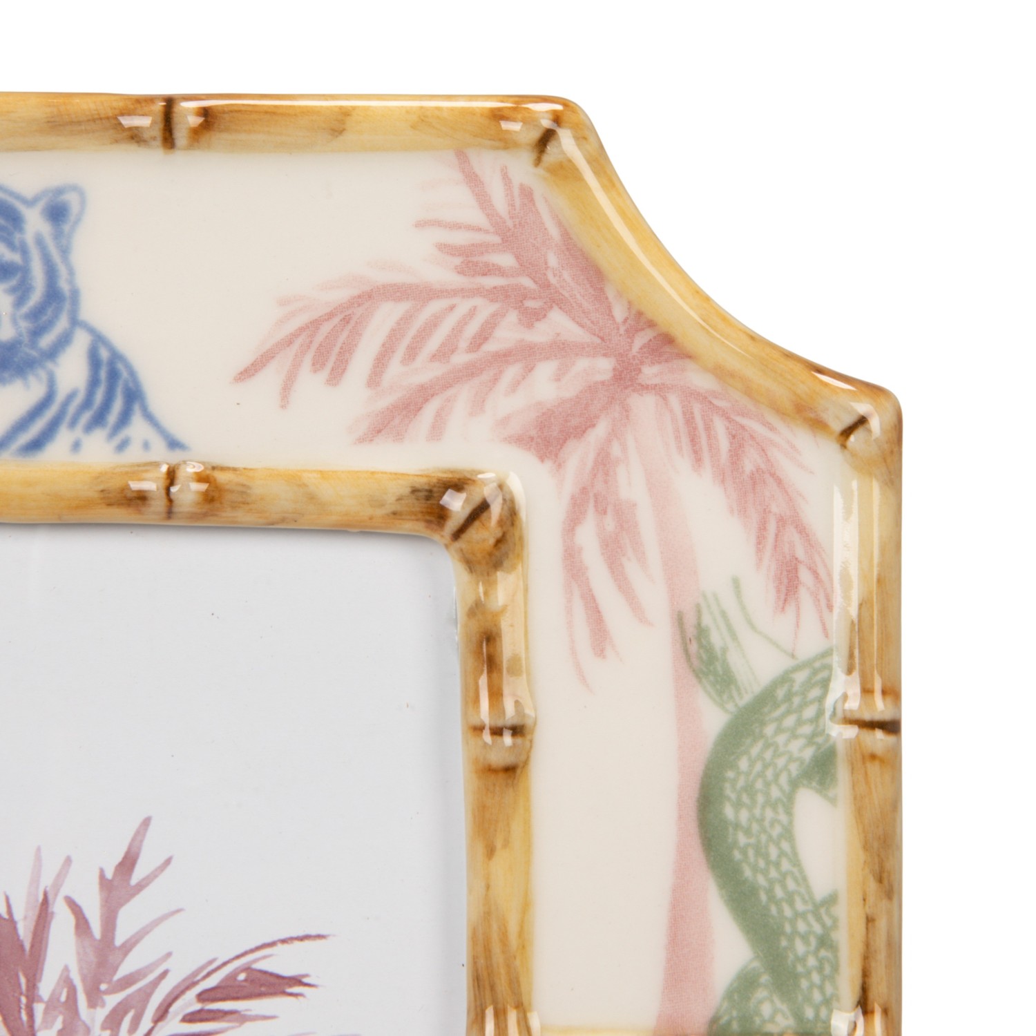 Catalog Name: 9-1/2"W x 8"H Hand-Painted Stoneware Photo Frame w/ Palm Trees, Animals & Bamboo Style Edge, Multi Color (Holds 5" x 7" Photo)