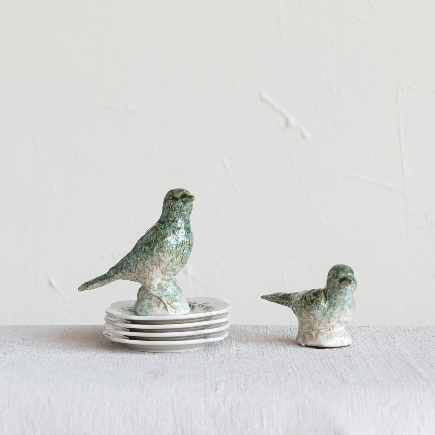 Intentionally curate an elegant, storied space with our thoughtfully crafted collection of figures and figurines. Peruse a vast selection of unique, display-worthy pieces designed to individualize any interior design scheme including animals, architecture, vintage reproductions, boats, sea life, sports paraphernalia, fairytale-inspired scenes, abstract sculptures, bells, hourglasses, food items, chains, flora, and so much more. Choose from a wide array of materials from stoneware and metal to wood and resin, and styles from mid-century modern and cottage to farmhouse and contemporary. Bring whimsy, nostalgia, sophistication, or any desired ambiance to a living space with the simple addition of a figure or figurine. This cottage-inspired set of bird figurines showcase debossed stoneware construction in a naturally variating reactive glaze. Display in a living space of any style from cottage to garden. Add a touch of personal style to a mantelpiece or shelfscape with this decorative set of bird figurines. Made from stoneware.