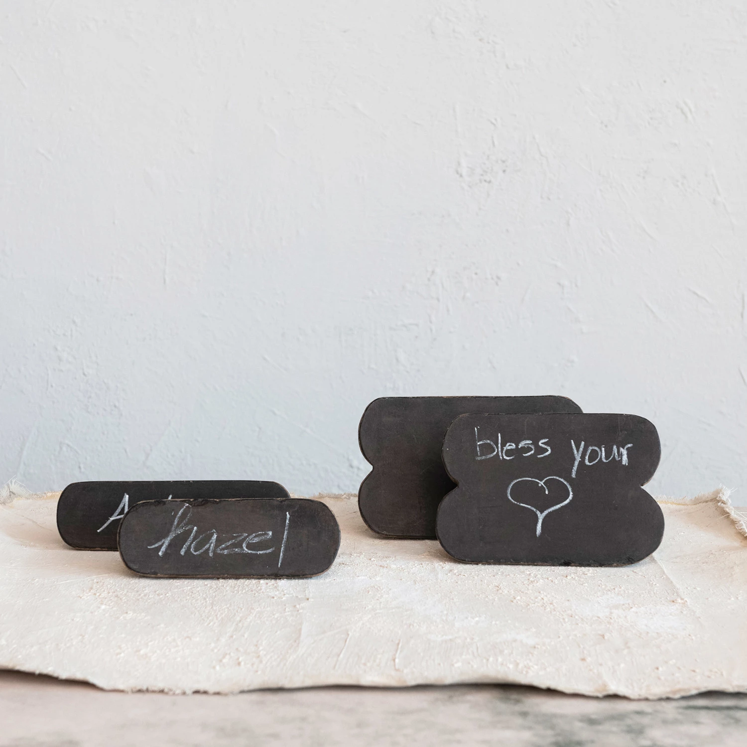 Catalog Name: Approximately 7"L x 3"W x 2"H MDF & Found Wood Standing Sign, Black Chalkboard Finish (Each One Will Vary)