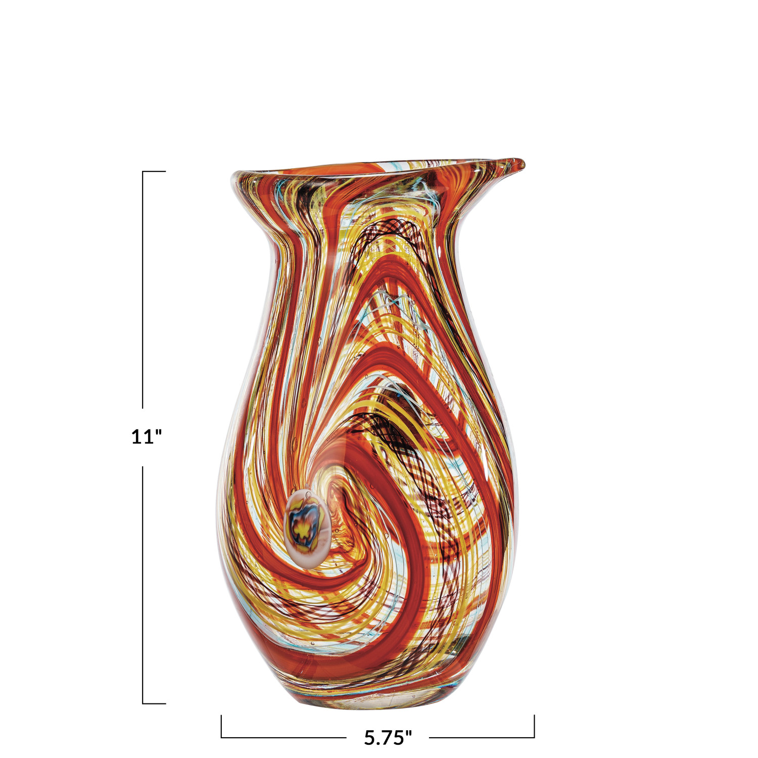 This Handmade Art Glass Vase is a true work of art, capturing the essence of a kaleidoscope with its array of colors and intricate patterns. Each vase is crafted with care, ensuring that no two are exactly alike, much like the ever-changing patterns of a kaleidoscope. The round shape and substantial height make it a significant presence in any room, while the multi-colored glass reflects light and color in a way that is both soothing and exhilarating. It measures 5.75 inches in diameter and 11 inches in height, offering a bold statement piece that captures the eye and the imagination. Whether used to display a bouquet of flowers or as a centerpiece in its own right, this vase is sure to be a conversation starter and a source of joy in the home.