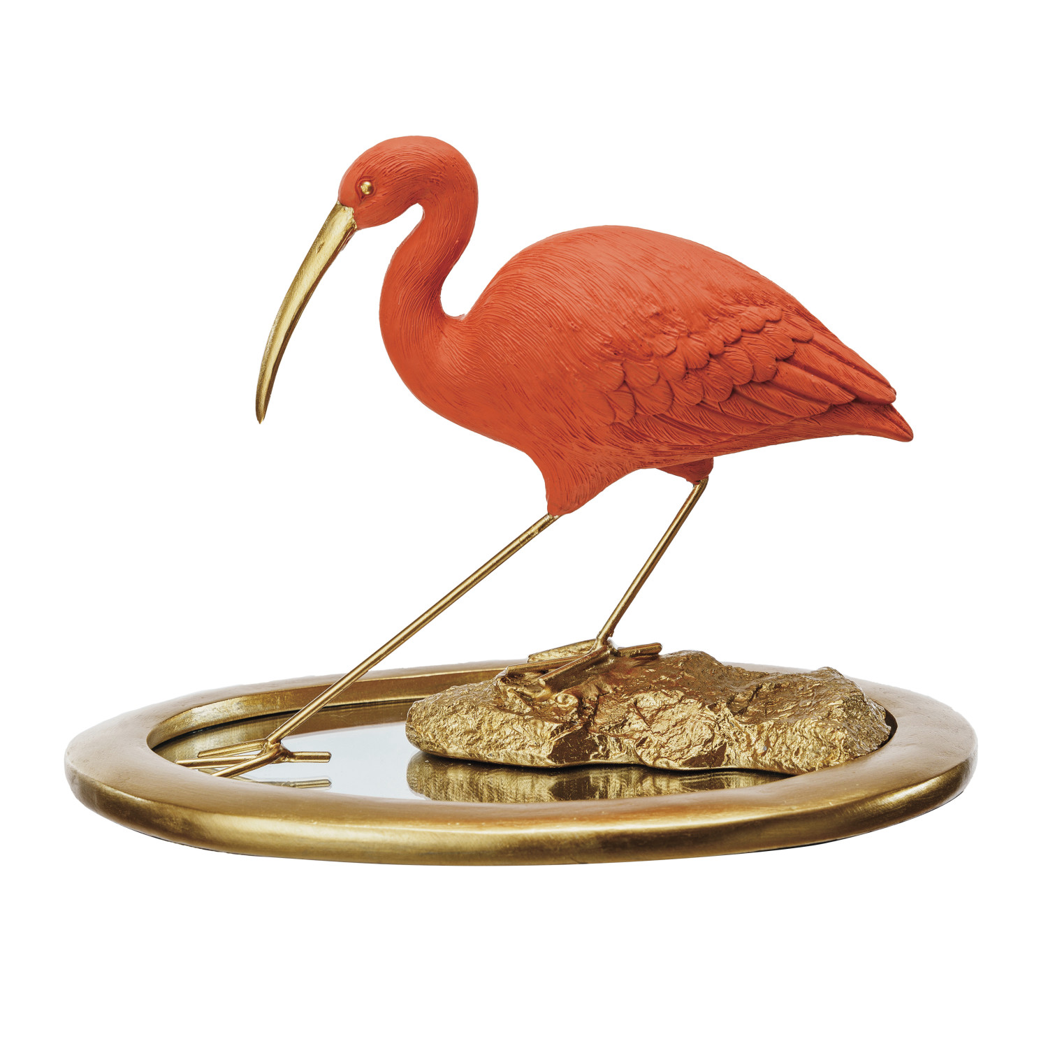 Catalog Name: 10"L x 8-1/4"W x 7"H Resin Scarlet Ibis on Mirrored Tray, Gold Finish & Coral Color