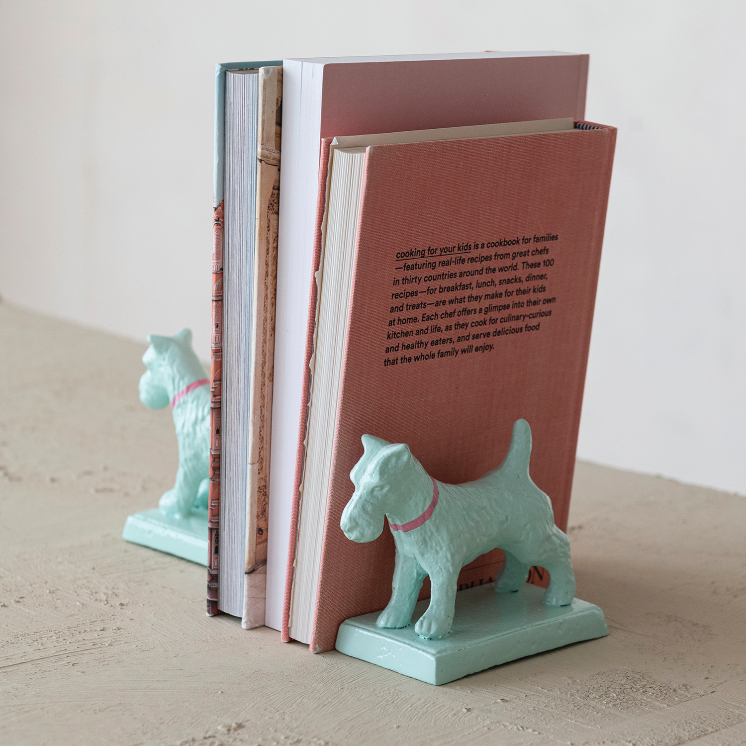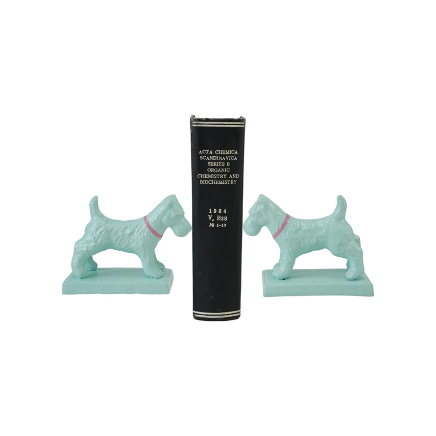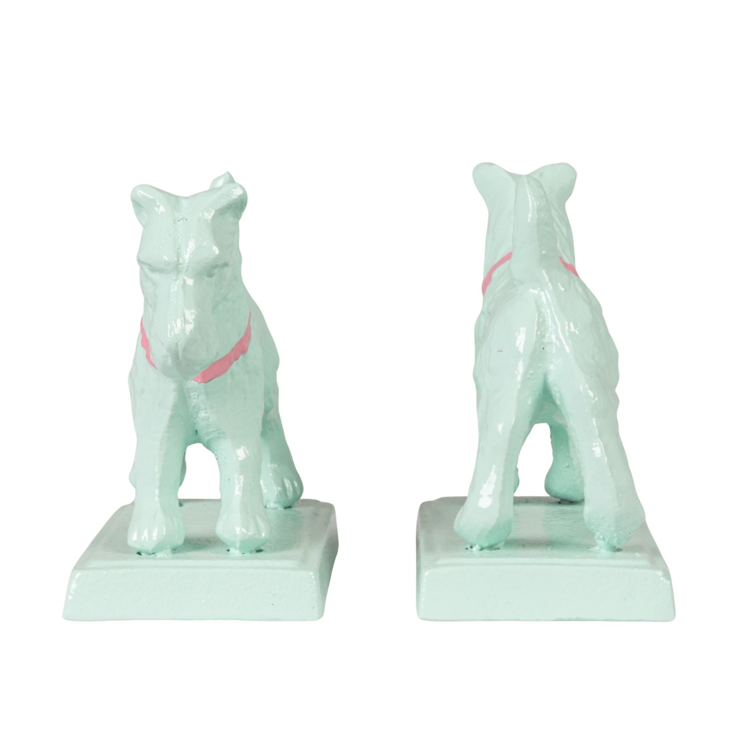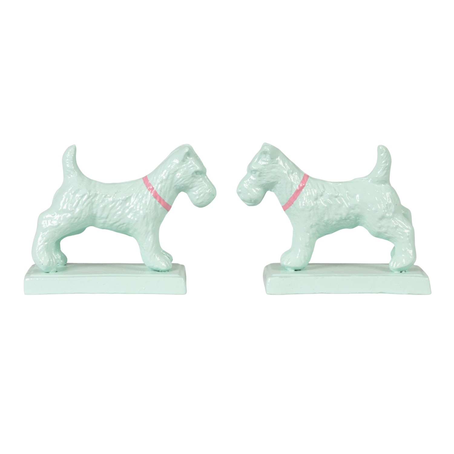 Catalog Name: 5-1/2"L x 2-1/4"W x 4"H Metal Dog Shaped Bookends w/ Pink Collar, Mint Color, Set of 2