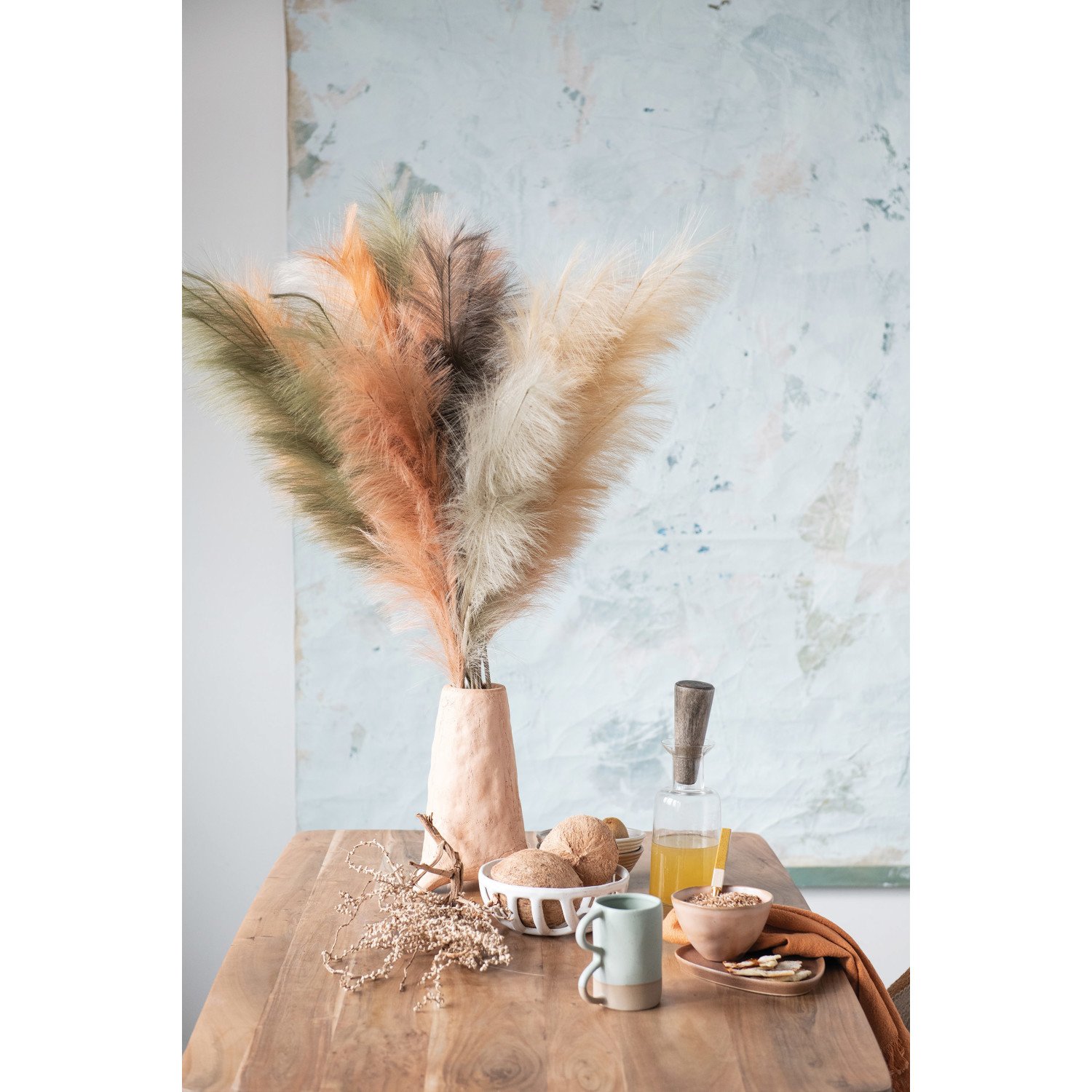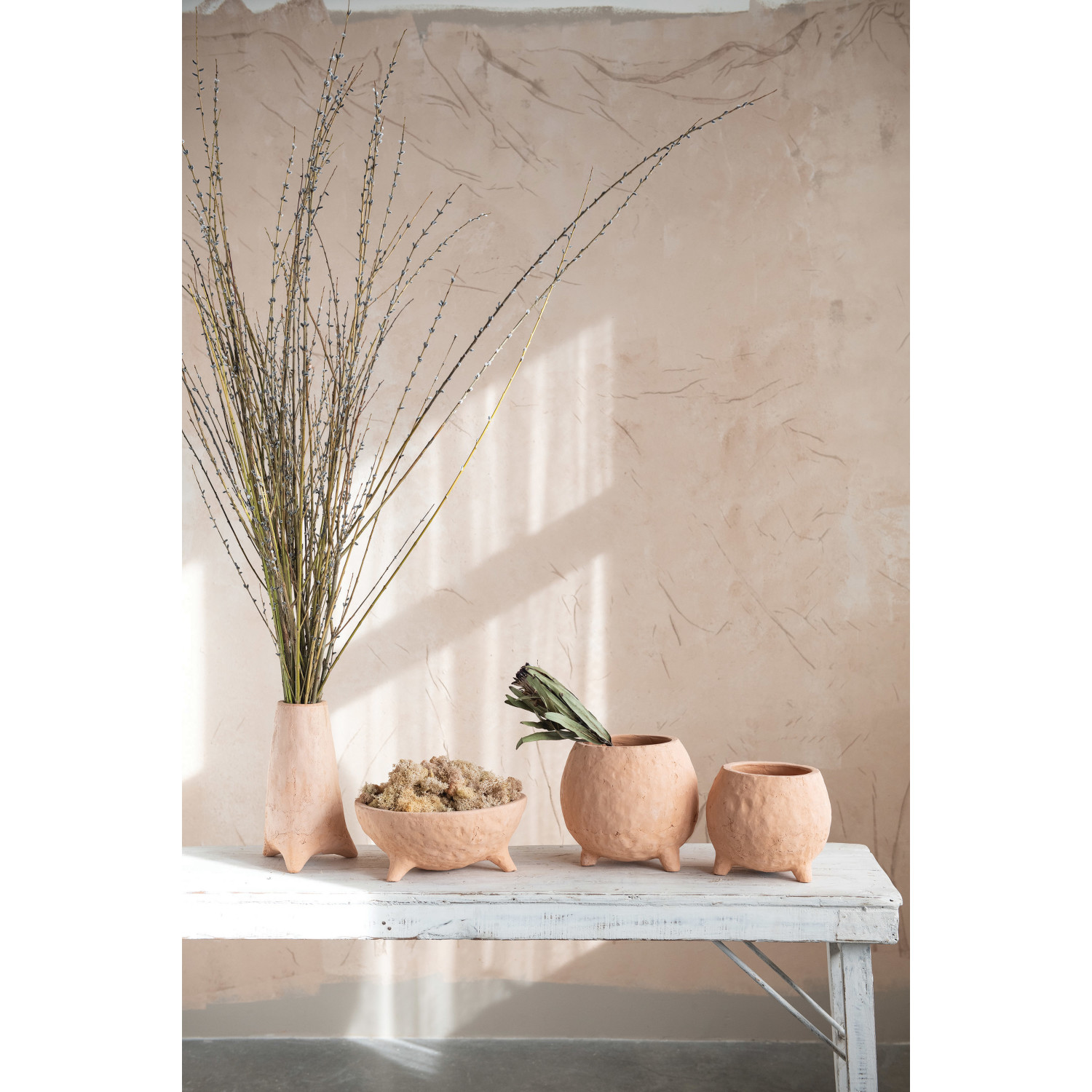 This vase is a beautiful way to display faux or real florals. Made out of terracotta, this vase has a beautiful terracotta color and organic shape. This vase looks great on table tops and shelves, and displays any real or faux florals or stems in a beautiful way.