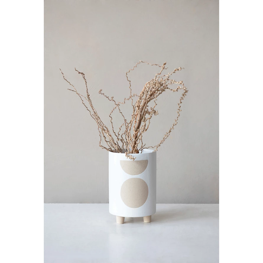 Catalog Name: 5-1/2" Round x 8"H Stoneware Footed Planter/Vase w/ Circle Design, White (Holds 5" Pot)