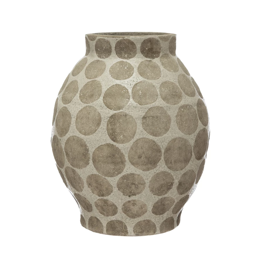 Catalog Name: 12-1/2" Round x 15-1/2"H Terra-cotta Vase w/ Wax Relief Dots, Cream & Cement Color, Truck Ship