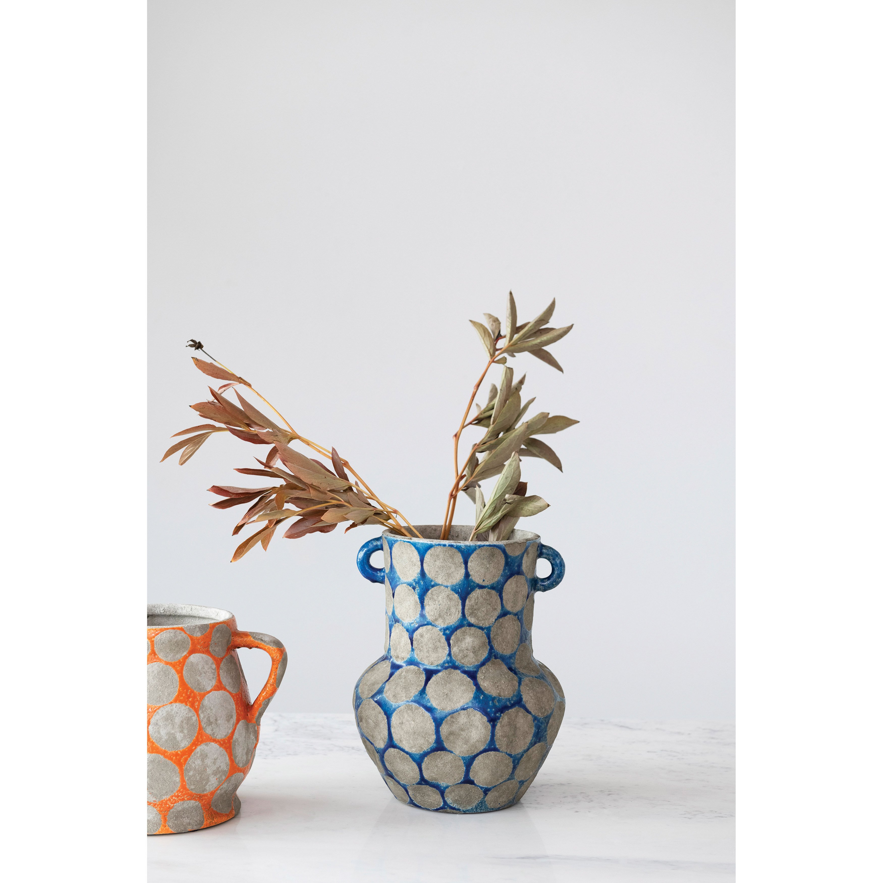 Add some color and style to the home with this terra-cotta vase that features a dark blue and cement color scheme and wax relief dots. This vase is perfect for adding a touch of coastal charm to any style of home décor, from nautical to tropical. The vase is designed for decorative purposes only and does not have drainage holes, so it is suitable for displaying dried or artificial flowers. Made of terra-cotta.