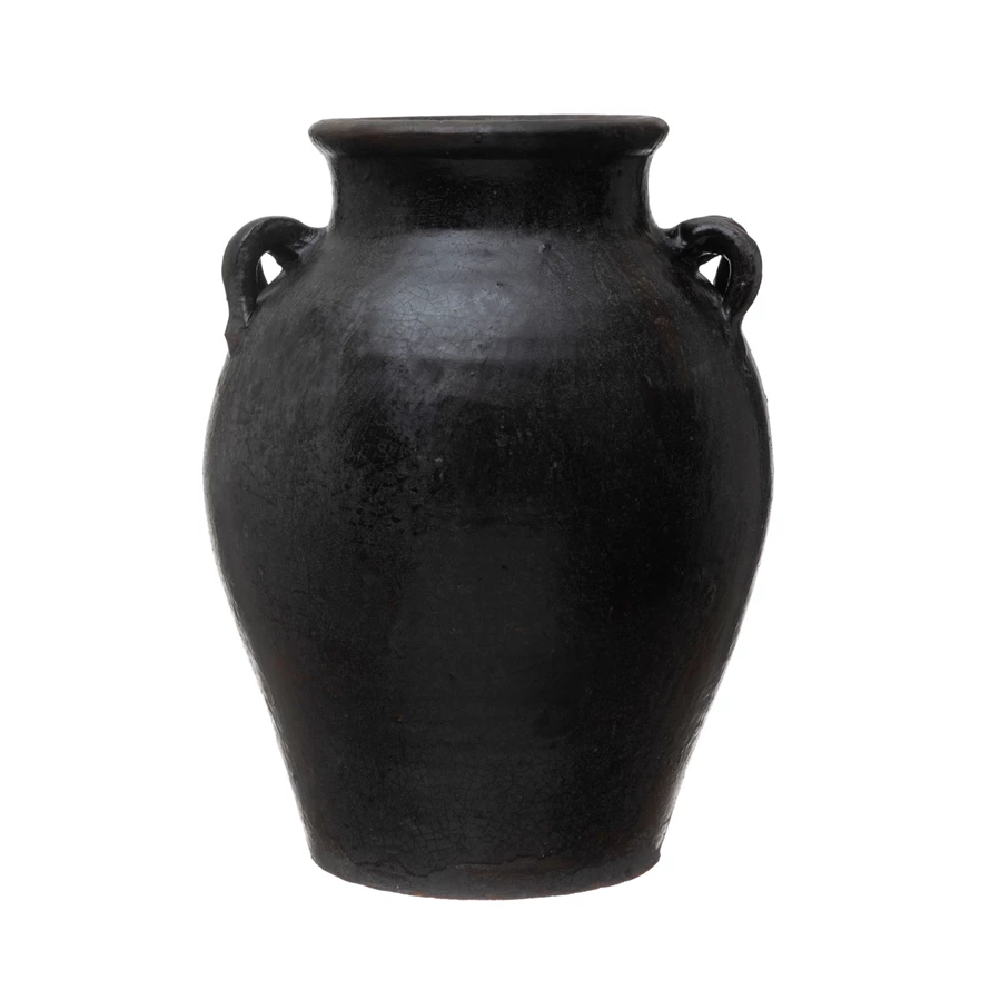 Catalog Name: Approximately 9-1/2" Round x 11-3/4"H Found Decorative Clay Jar, Distressed Black (Each One Will Vary)