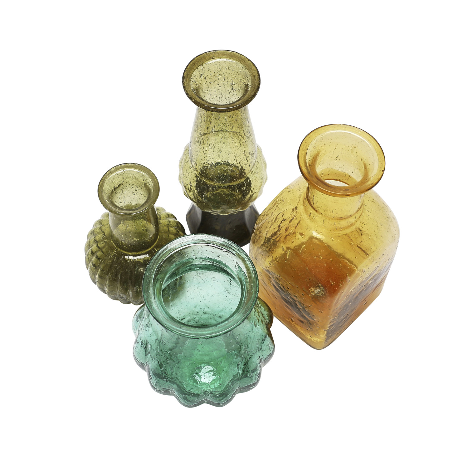 A set of four charming glass vases in different shapes, colors, and sizes. Can be used as a vase for fresh or artificial flowers, or as a decorative piece on its own.