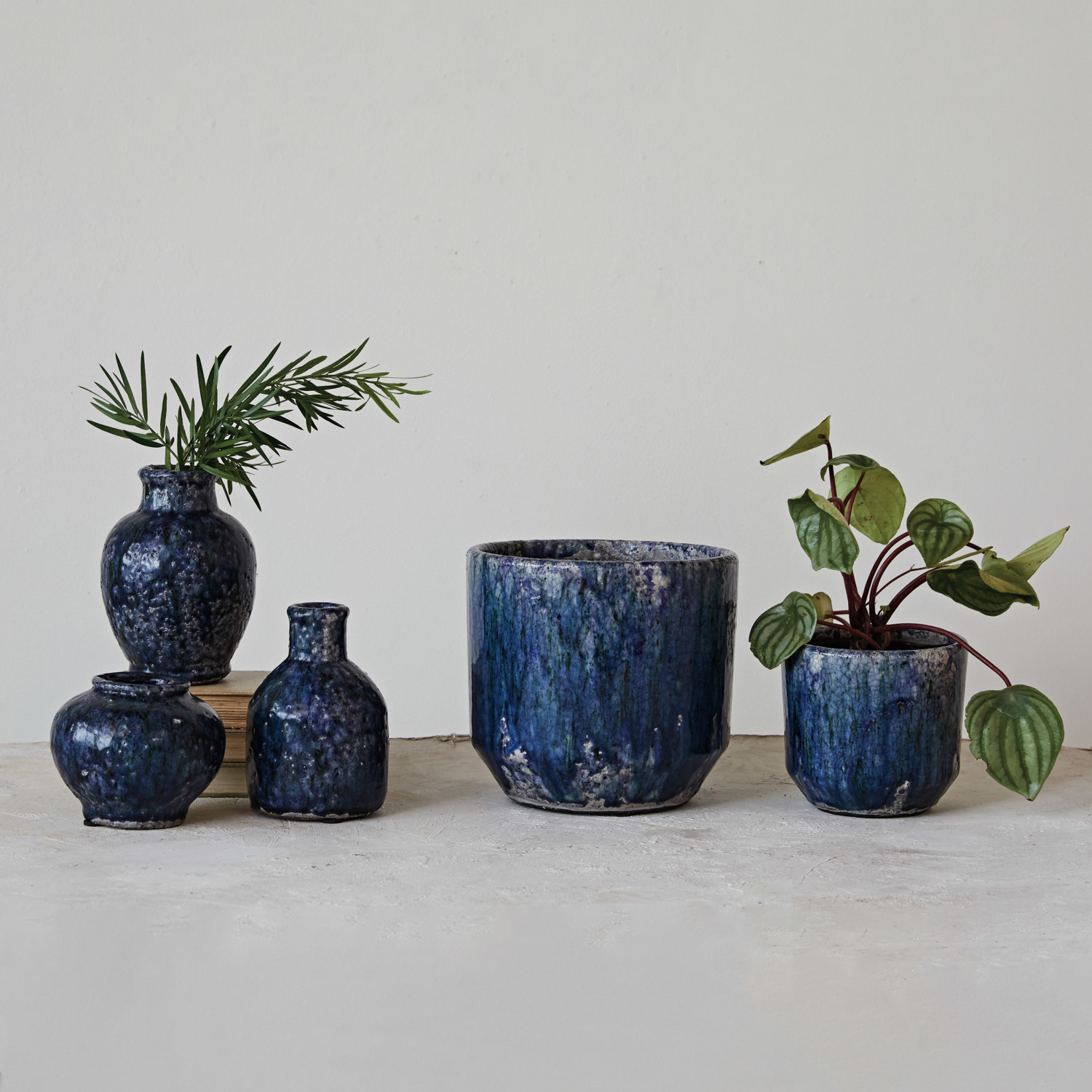 Catalog Name: 4" Round x 6"H, 5" Round x 6-1/2"H & 5-1/4" Round x 4-1/2"H Decorative Terra-cotta Vases, Crackle Glaze, Blue, Set of 3 (Each One Will Vary)