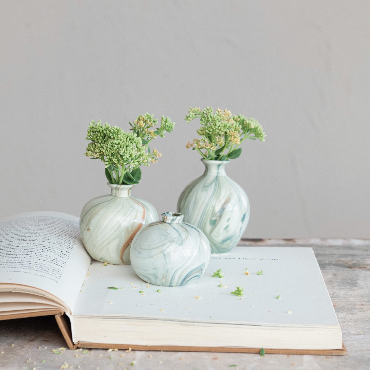 This set of three round stoneware vases with a green marbled design is a must-have for home decor enthusiasts. The vases have a unique pattern resembling natural marble, creating a striking contrast against a white background. Available in three sizes, they can be filled with fresh or dried flowers, branches, or grasses, adding a touch of nature and elegance to any space. Made of high-quality stoneware, these vases are durable, easy to clean, and have a smooth glazed finish. Place it on tables, shelves, mantels, or windowsills, and create a cozy and inviating atmosphere. They make a great gift for those who appreciate farmhouse, garden, botanical, or coastal beach style.