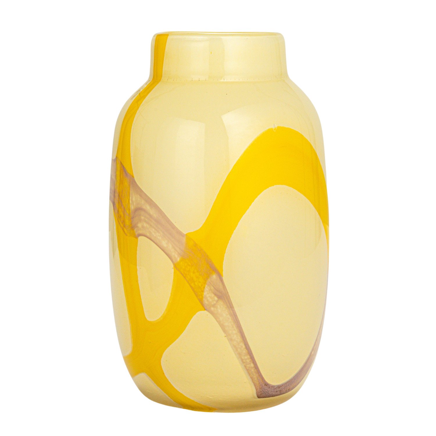 This round glass vase with a yellow and purple abstract design is a visually appealing and eye-catching home accessory. Made of transparent glass, it features a striking abstract design that resembles a painting or collage. The yellow and purple colors complement each other, creating a dynamic and energetic look. This vase can hold fresh or artificial flowers, plants, or branches, or be used as a standalone decorative piece. Place it on tables, shelves, mantels, or windowsills, and create a lively and inviting atmosphere. It is suitable for farmhouse, French country, boho, modern, or cottagecore styles and brightens up any room with its cheerful appearance. This vase is a wonderful gift for anyone who loves art and color.