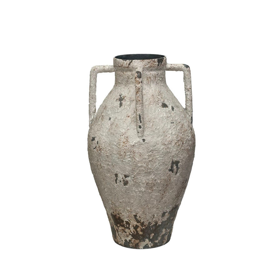 This Round Metal Urn exudes a sense of history with its heavily distressed white finish and traditional form. The design features two handles that add functionality and aesthetic appeal, making it a versatile piece for any room. It resonates with the rustic charm of farmhouse decor, the refined elegance of French country style, and the whimsical allure of cottagecore. Crafted from durable metal, it promises to be a lasting addition to any collection. The urn stands at 15.25 inches high and spans 8.25 inches round, offering ample space for creative expression whether filled with blooms or displayed as is.