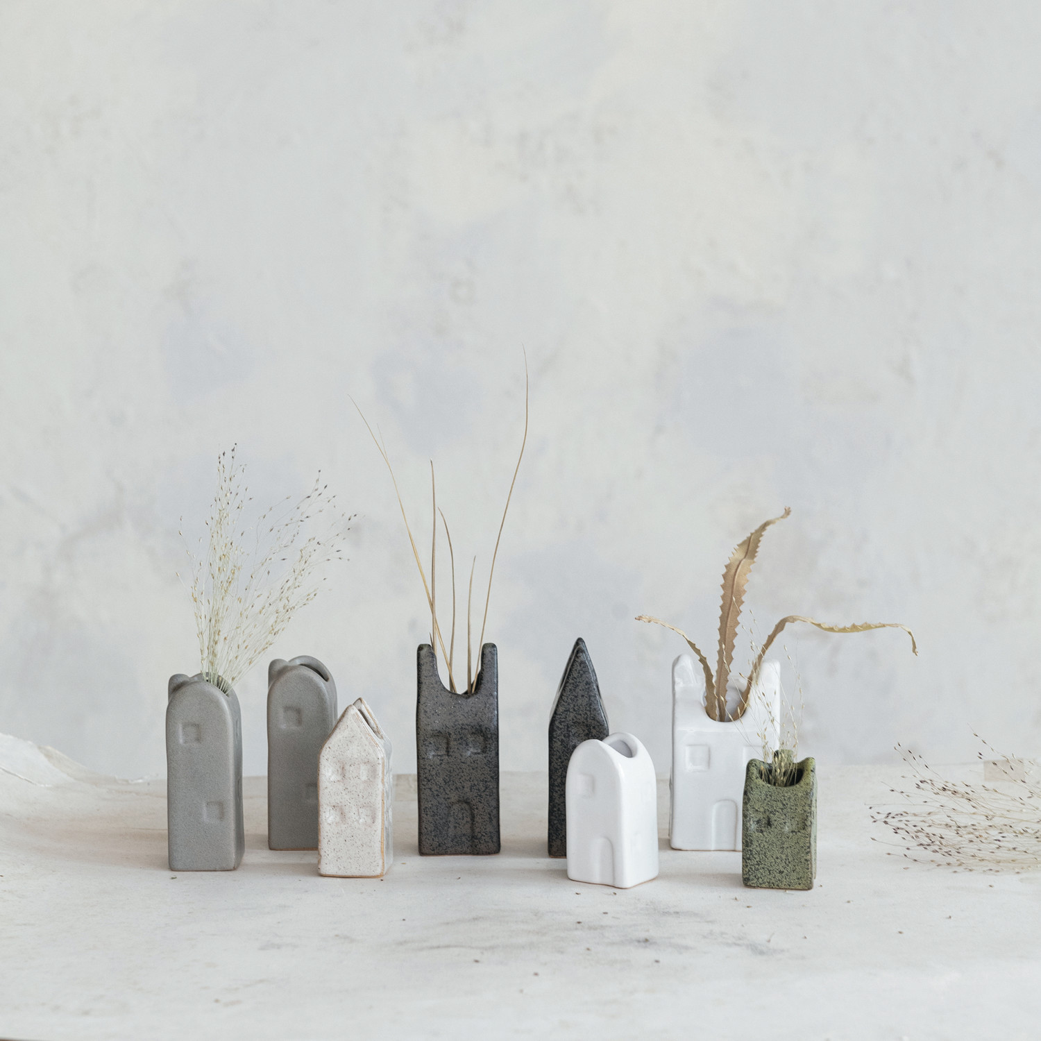 This set of 8 House-Shaped Vases is a whimsical addition to any home. Each piece, with its reactive glaze, presents a unique pattern in a vibrant array of colors, reminiscent of a miniature village. The vases are thoughtfully arranged on a pine wood tray, adding a rustic touch that complements the stoneware's artisanal charm. The set's design is a nod to various styles, from the cozy farmhouse to laid-back boho, making it a versatile choice for those who appreciate a blend of traditional and contemporary elements. The vases range from 2 to 3.75 inches in height. It's not just a decorative item but a conversation starter that brings a sense of community and artistry to the living space.