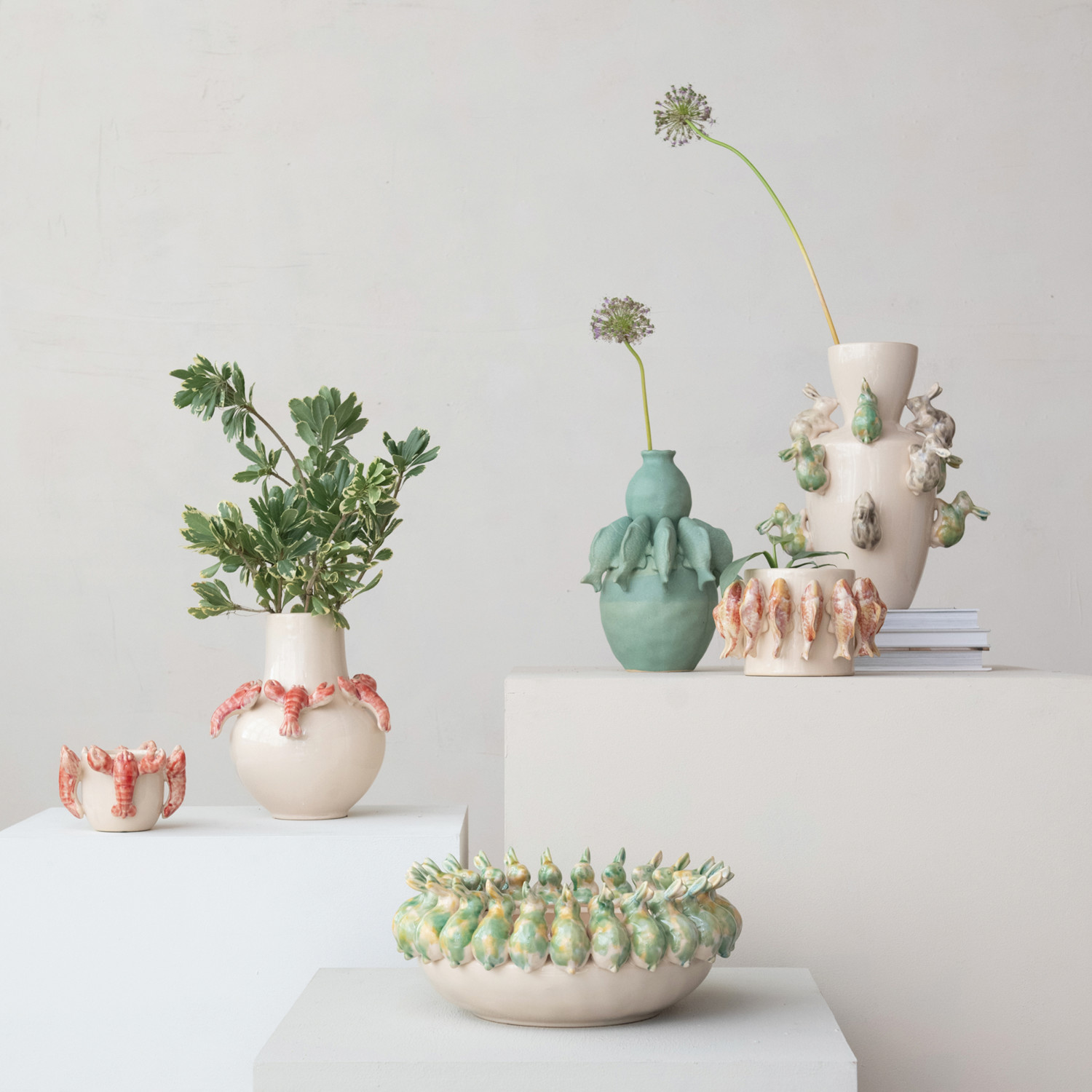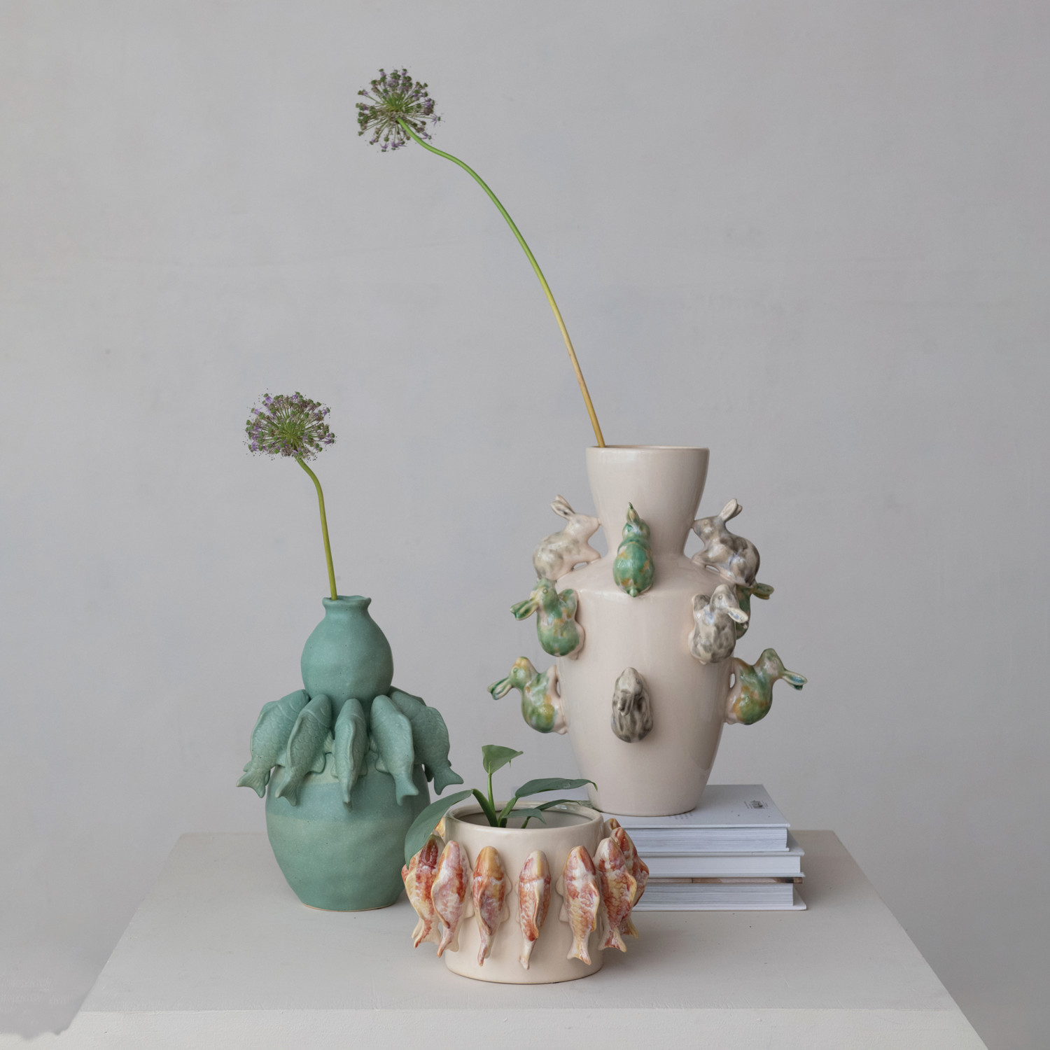 Stoneware Vase w/ 3D Rabbits, Reactive Glaze (Each One Will Vary)