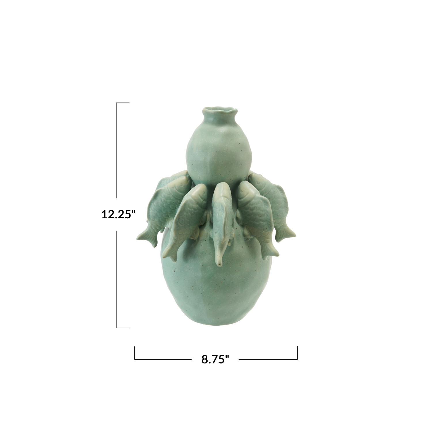 Catalog Name: 8-3/4" Round x 12-1/4"H Stoneware Vase w/ 3D Fish, Reactive Glaze, Matte Sage Green, Truck Ship (Each One Will Vary)