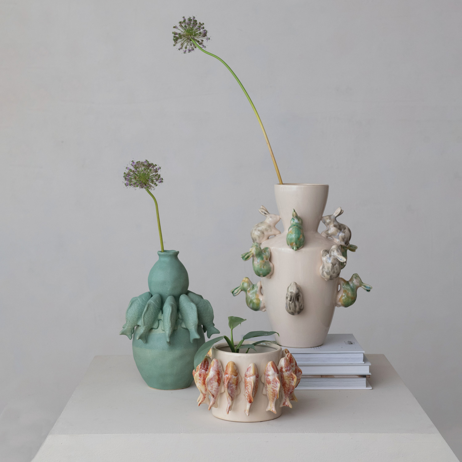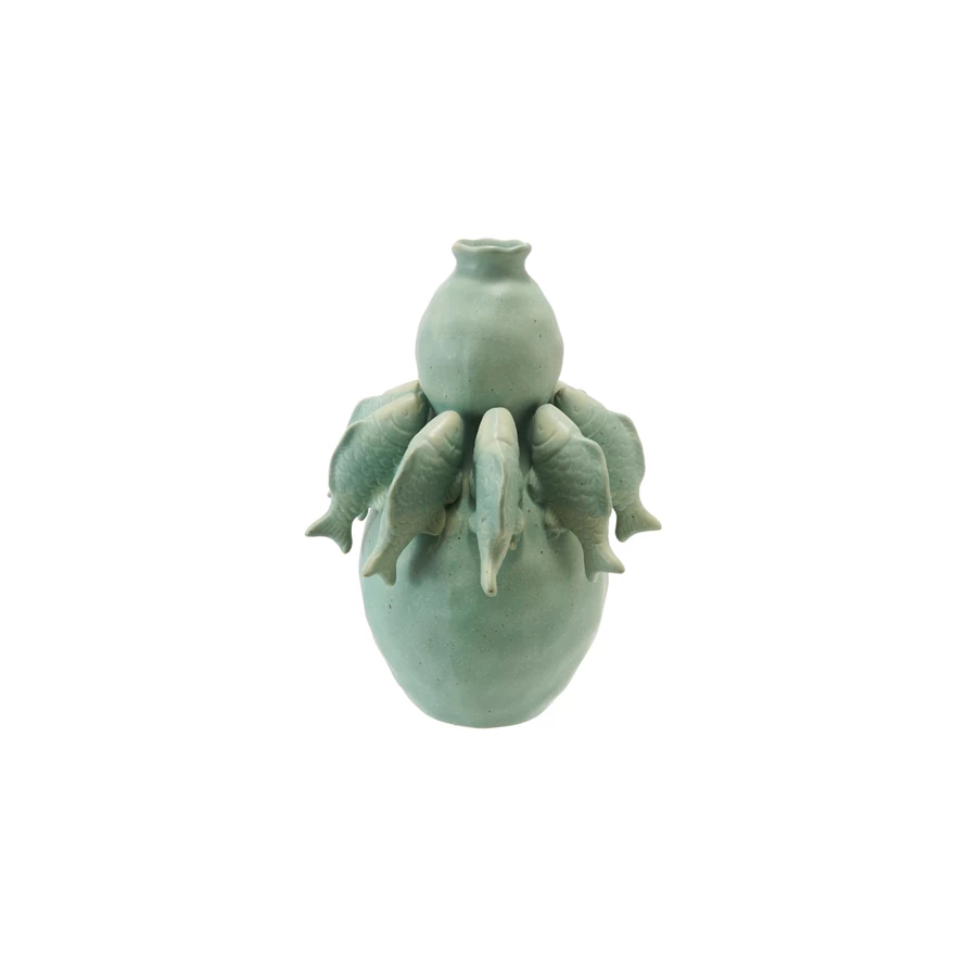 Stoneware Vase w/ 3D Fish, Reactive Glaze, Matte Sage Green (Each One Will Vary)