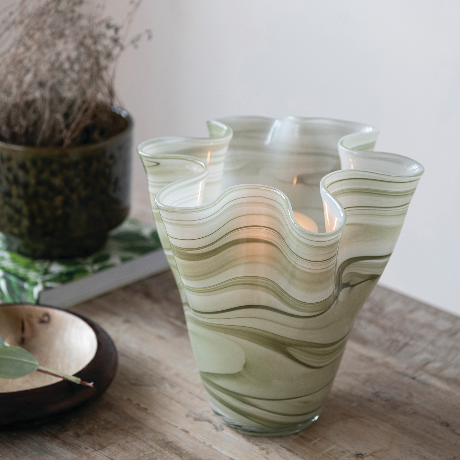 Hand-Blown Glass Ruffled Vase with Swirled Design, Opaque Green & White (Each One Will Vary)