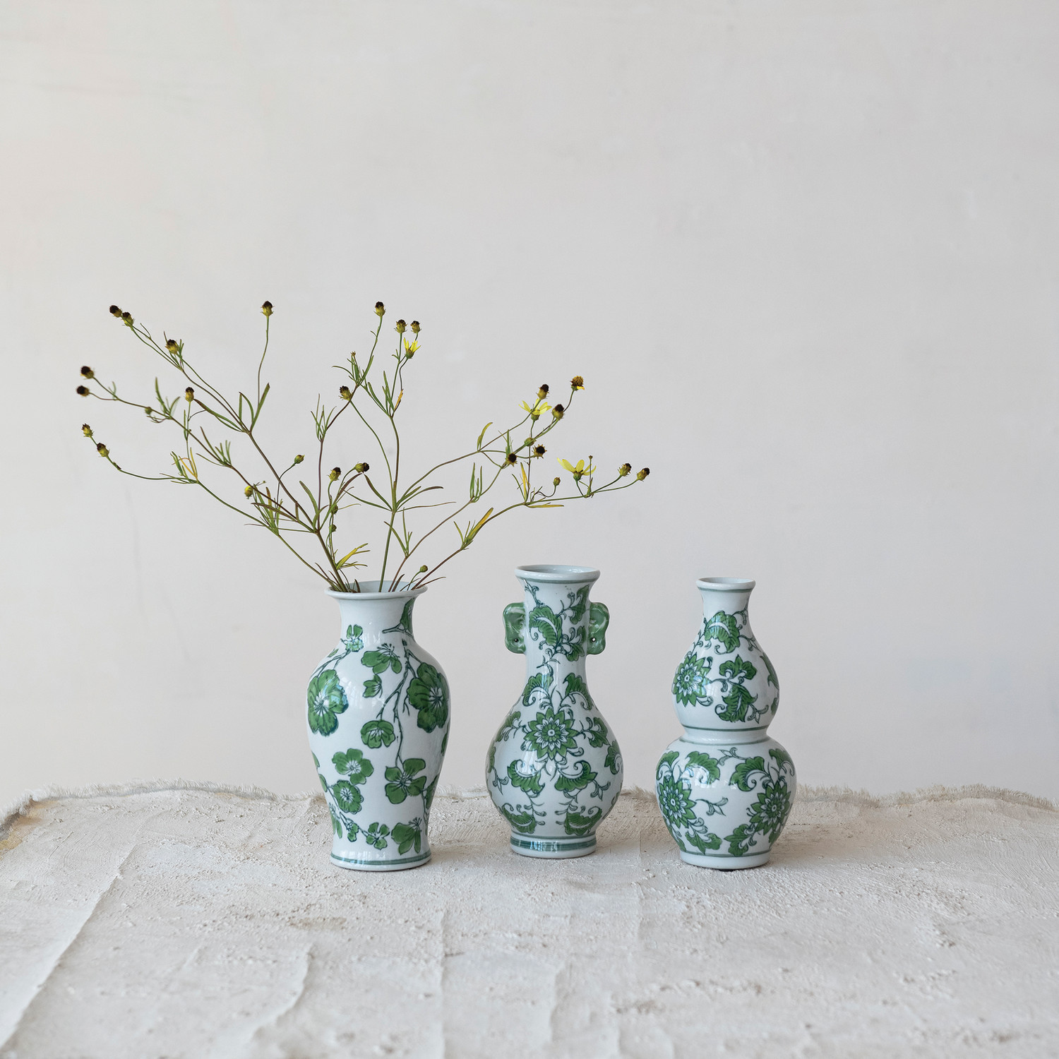 Catalog Name: 3" Round x 7"H Hand-Painted Stoneware Vase w/ Floral Design, Green & White, 3 Styles