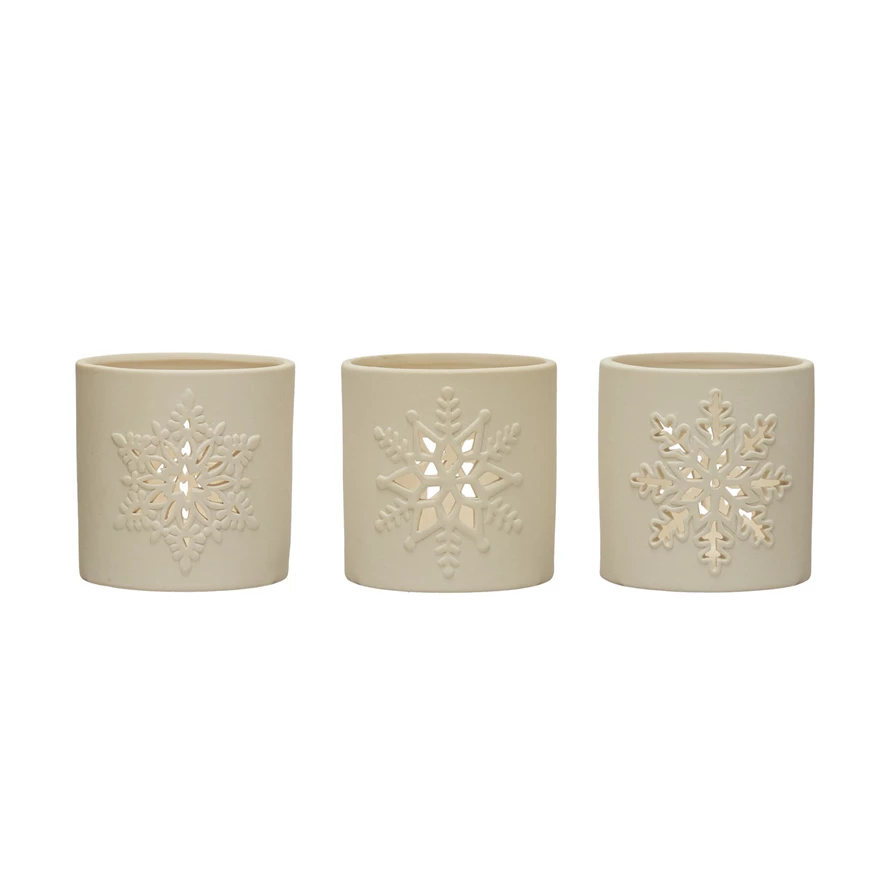 Stoneware Bisque Tealight Holder with Snowflake Cut-Out, 3 Styles