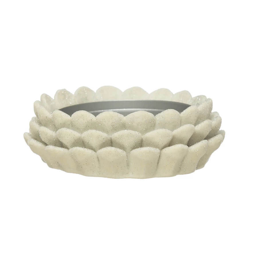 Catalog Name: 5-1/4" Round Flocked Resin Pinecone Pillar Holder with Glitter, White (Holds 3" Pillar)