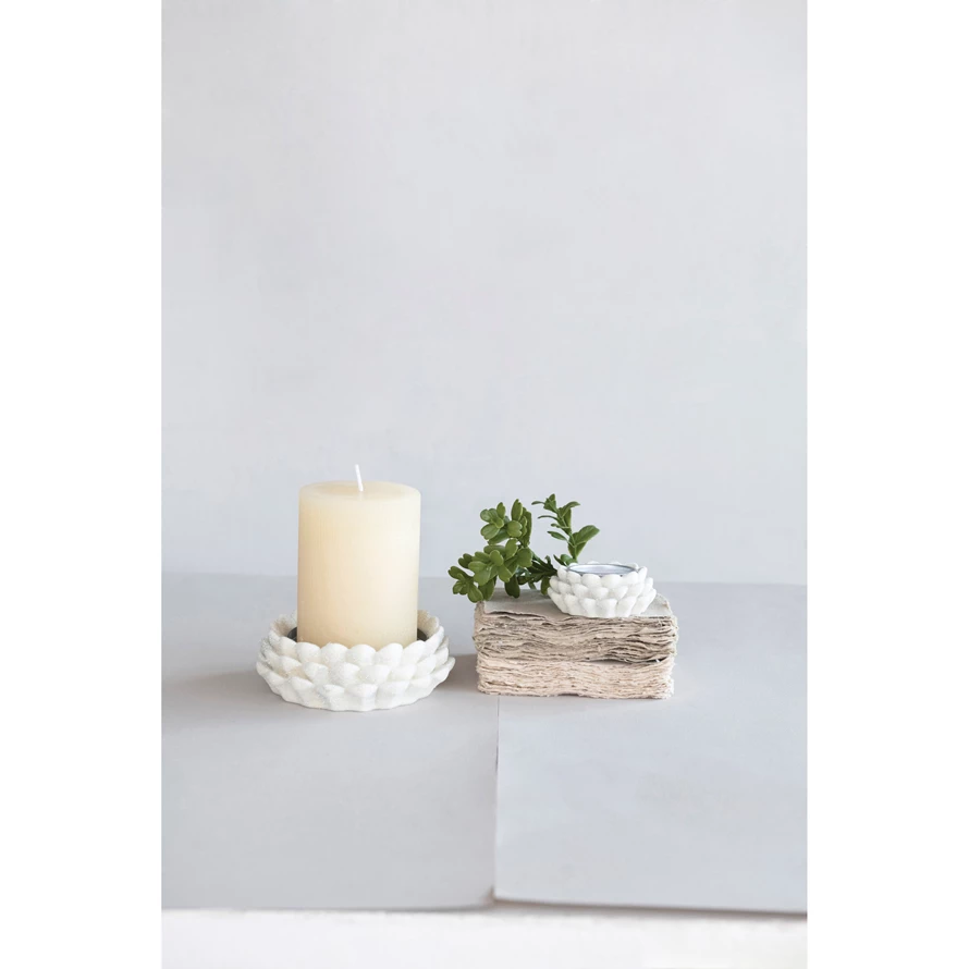 5-1/4" Round Flocked Resin Pinecone Pillar Holder with Glitter, White (Holds 3" Pillar)