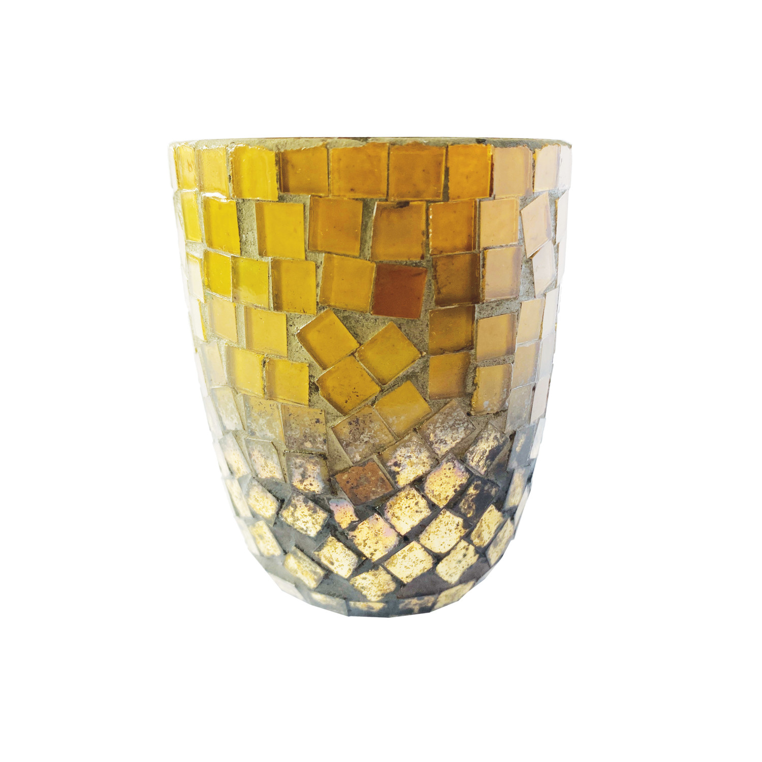 Catalog Name: 3" Round x 3-3/4"H Recycled Glass Mosaic Tealight/Votive Holder, Antique Gold Finish, Brown
