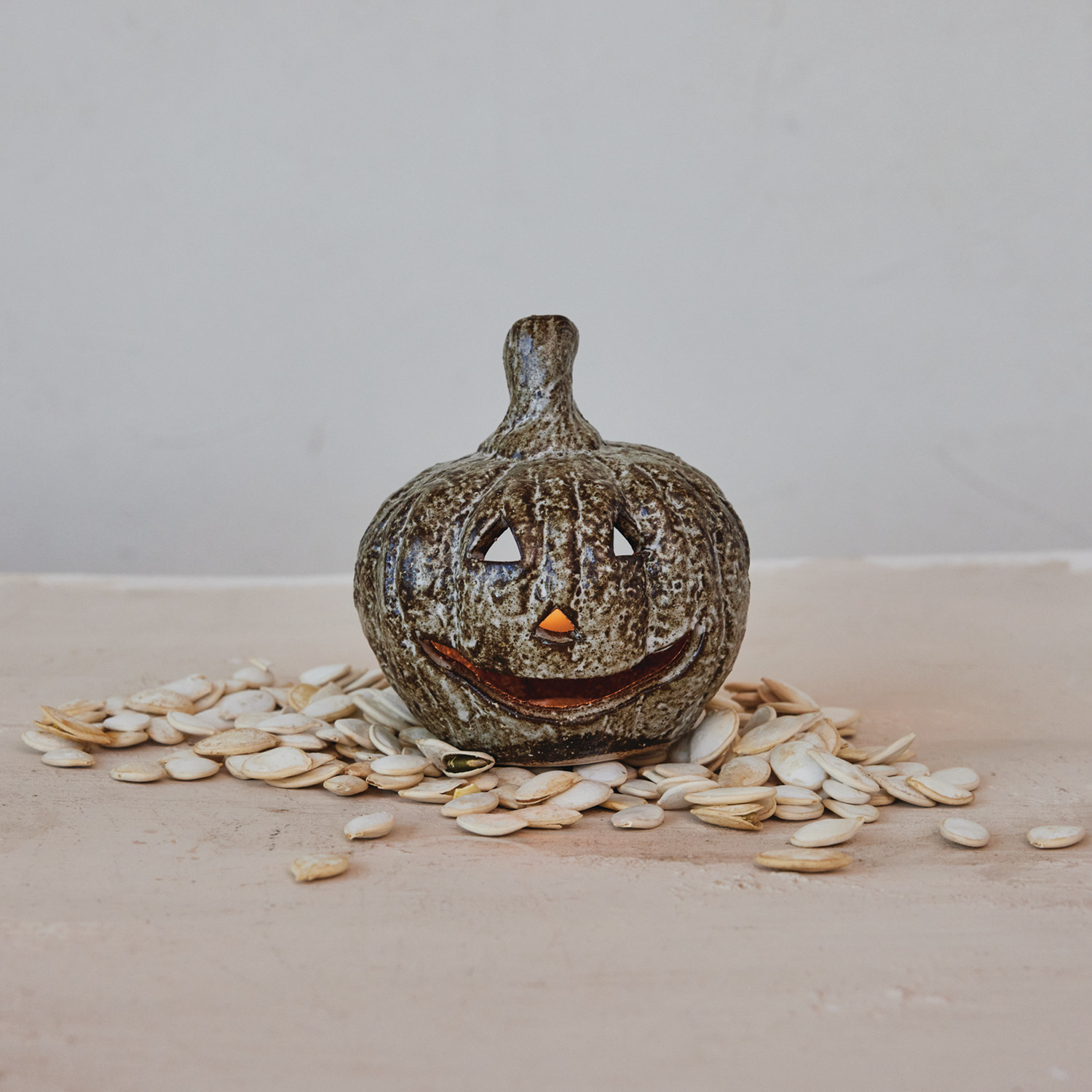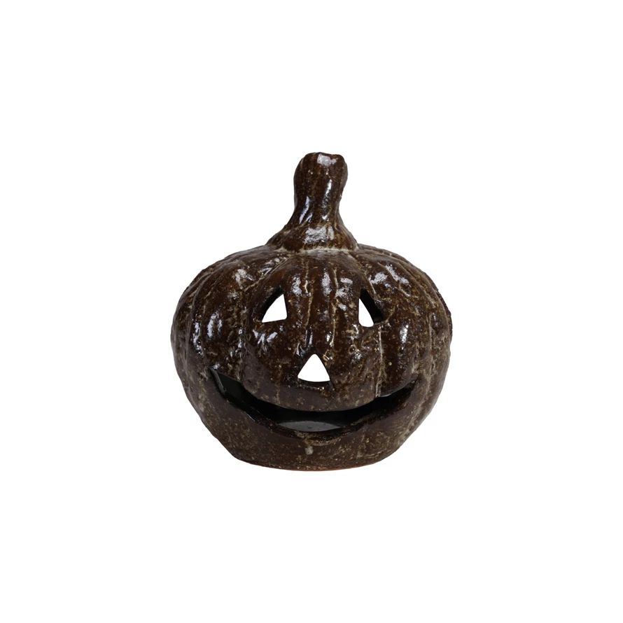 Catalog Name: 4" Round x 4-3/4"H Stoneware Pumpkin Tealight Holder w/ Cut-Out Jack-O-Lantern Face, Reactive Glaze, Brown (Each One Will Vary)