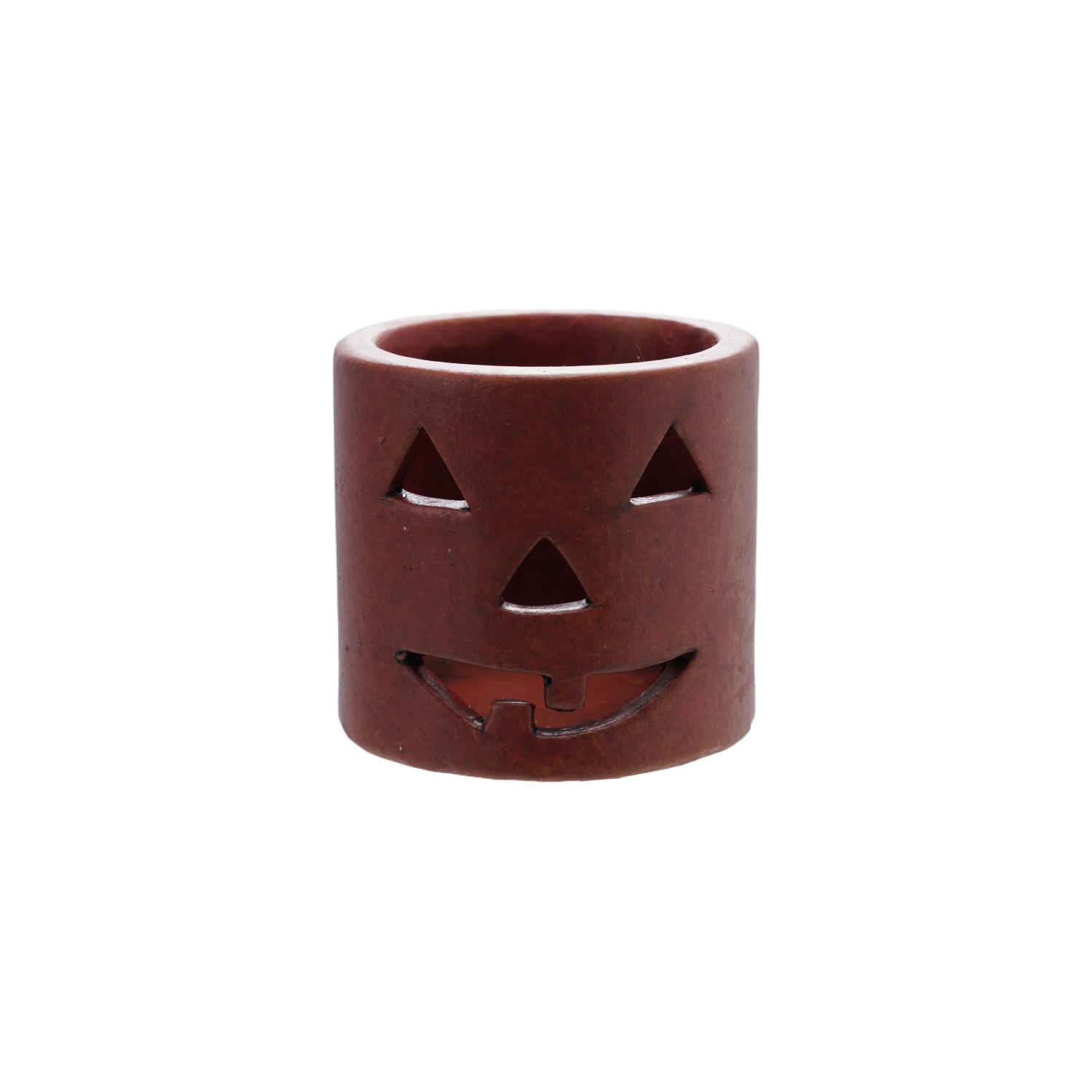 Catalog Name: 3-1/4" Round x 3"H Terra-cotta Tealight/Votive Holder w/ Cut-Out Jack-O-Lantern Face