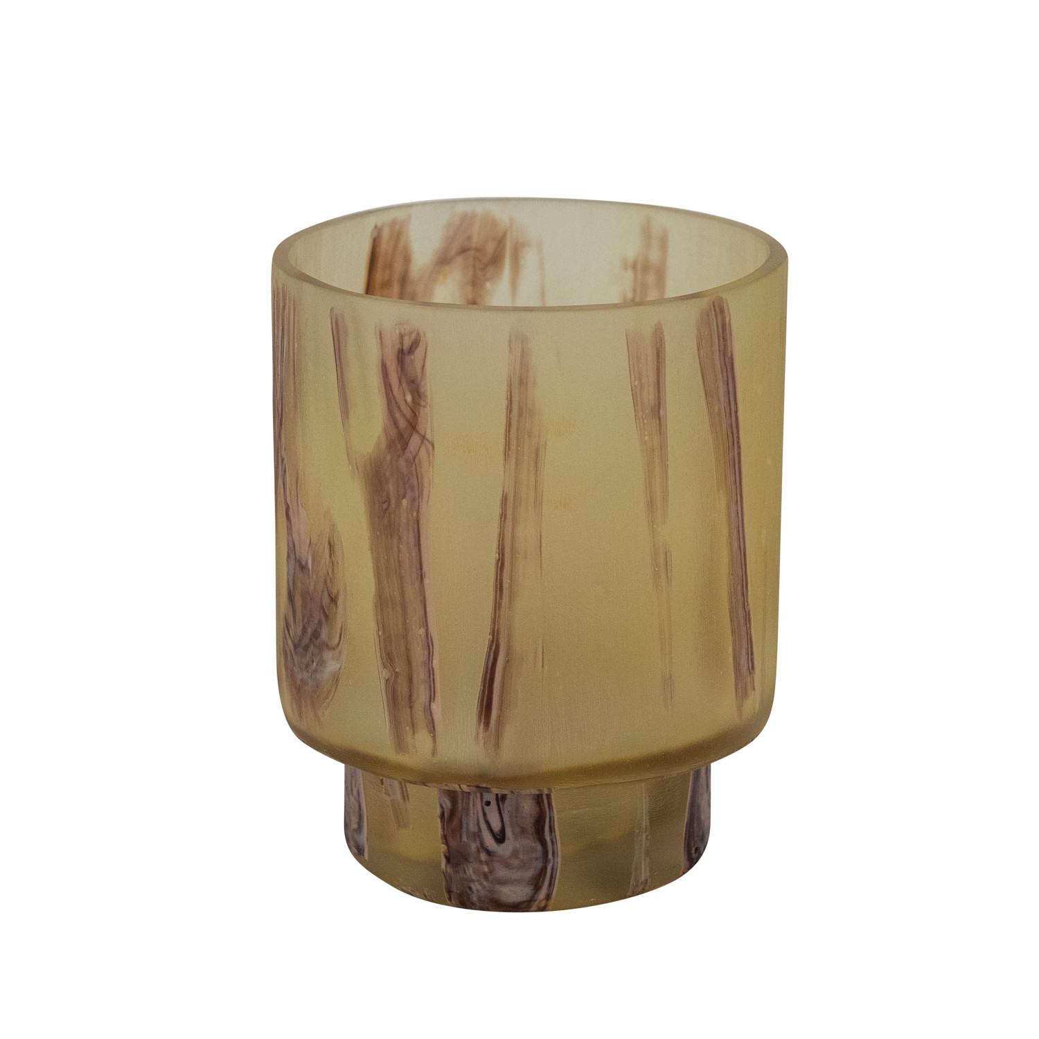 Catalog Name: 4" Round x 5"H Art Glass Footed Tealight/Votive Holder, Marbled Yellow, Brown & Orange Color (Each One Will Vary)