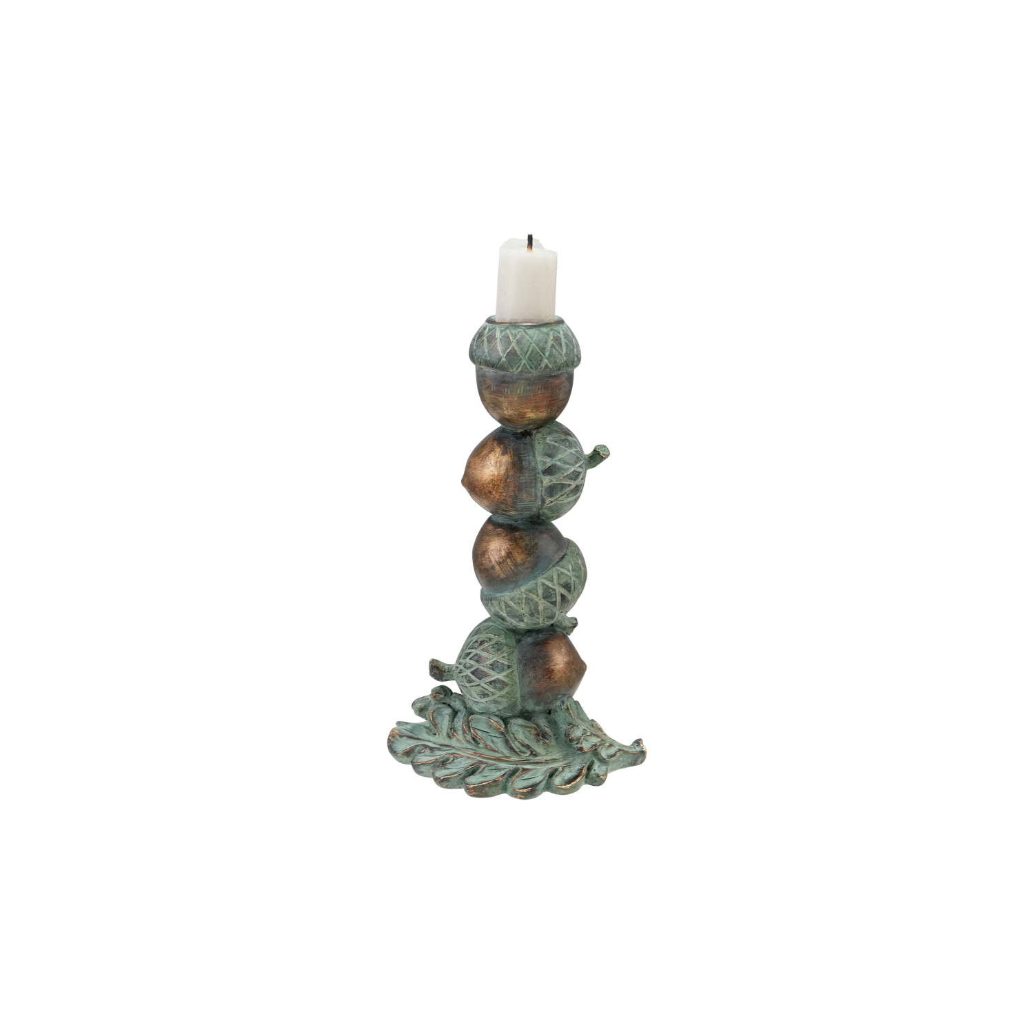 Catalog Name: 4"L x 3"W x 7"H Resin Stacked Acorns Taper Holder, Verdigris & Copper Finish
