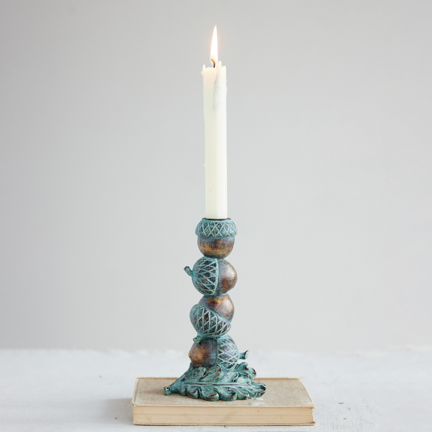 Resin Stacked Acorns Taper Holder, Verdigris & Copper Finish