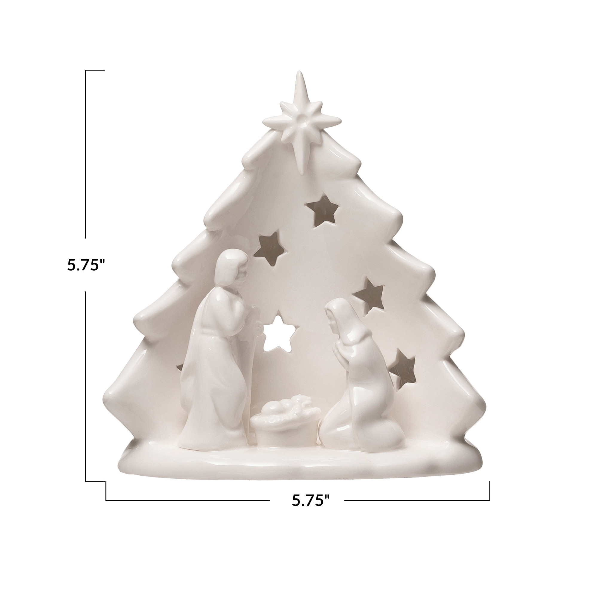 Catalog Name: 5-3/4"L x 4"W x 5-3/4"H Stoneware Holy Family w/ Tree & Cut-Outs, White