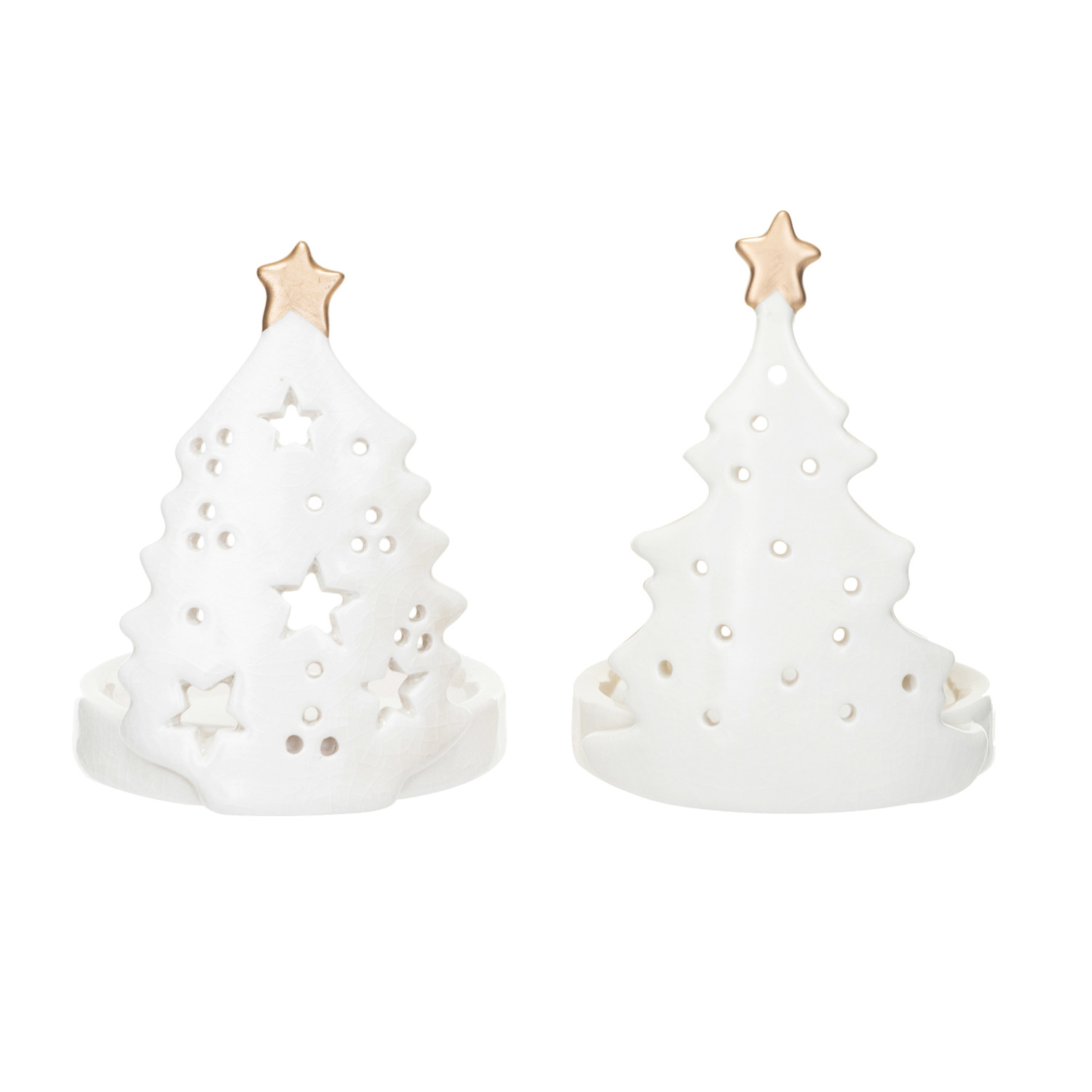 Catalog Name: 4"L x 3-3/4"W x 4-3/4"H Stoneware Christmas Tree Shaped Candle Holder w/ Cut-Outs & Gold Electroplating, Crackle Glaze, White, 2 Styles