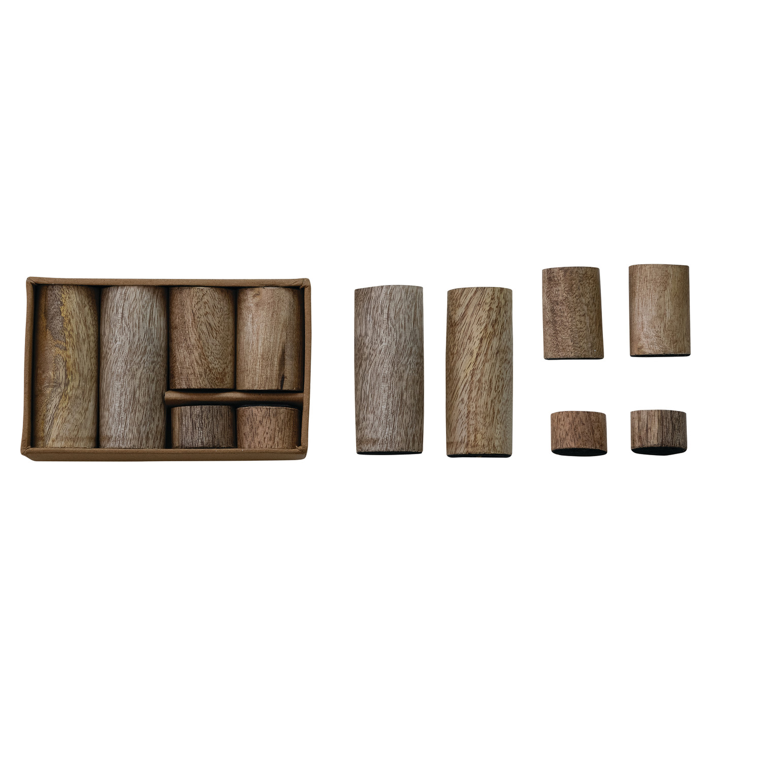 Catalog Name: (2) 1-1/4" Round x 3-1/4"H, (2) 1-1/4" Round x 2"H & (2) 1-1/4" Round x 1"H Mango Wood & Metal Magnetic Taper Holders, Natural, Boxed Set of 6