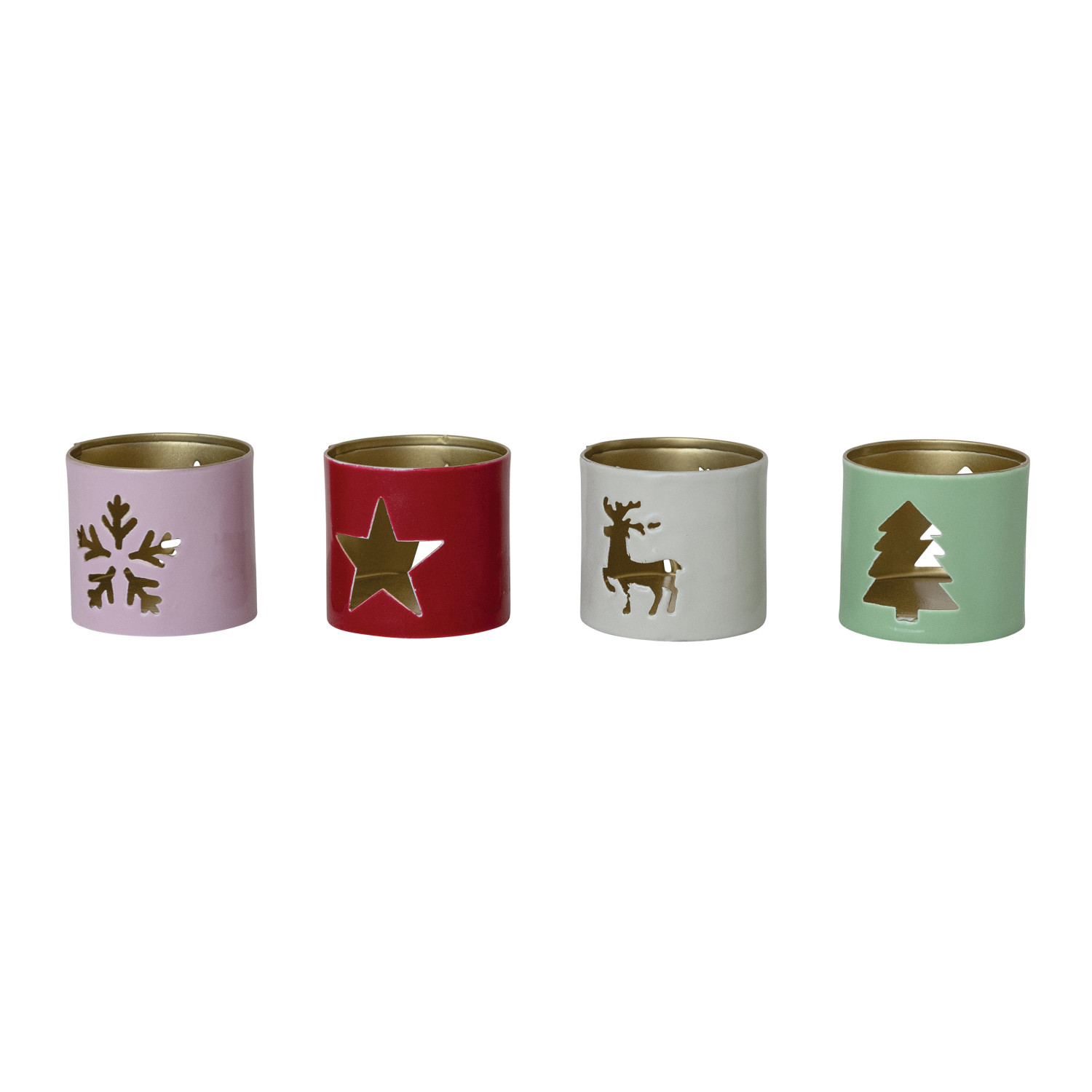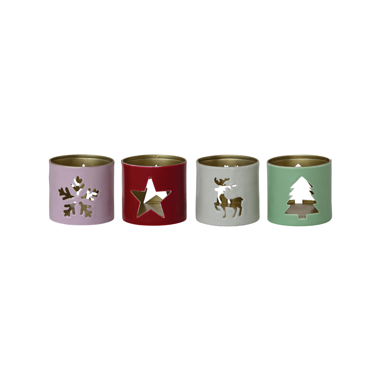 Catalog Name: 2" Round x 2"H Enameled Metal Tealight Holder w/ Holiday Icon Cut-Outs, Multi Color, 4 Styles