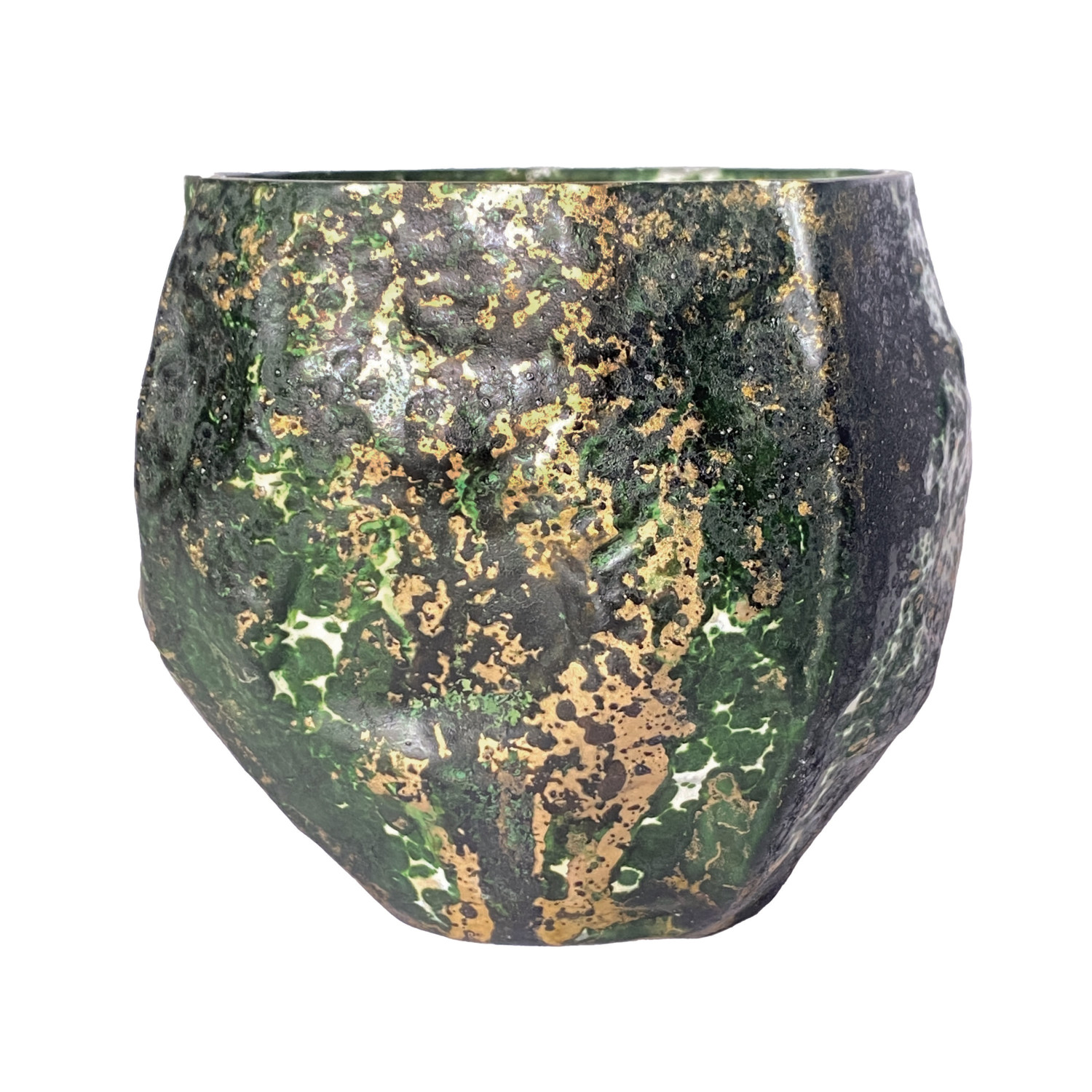 Catalog Name: 4-1/2" Round x 3-3/4"H Hand-Blown Mercury Glass Tealight/Votive Holder, Distressed Green & Gold Finish (Each One Will Vary)