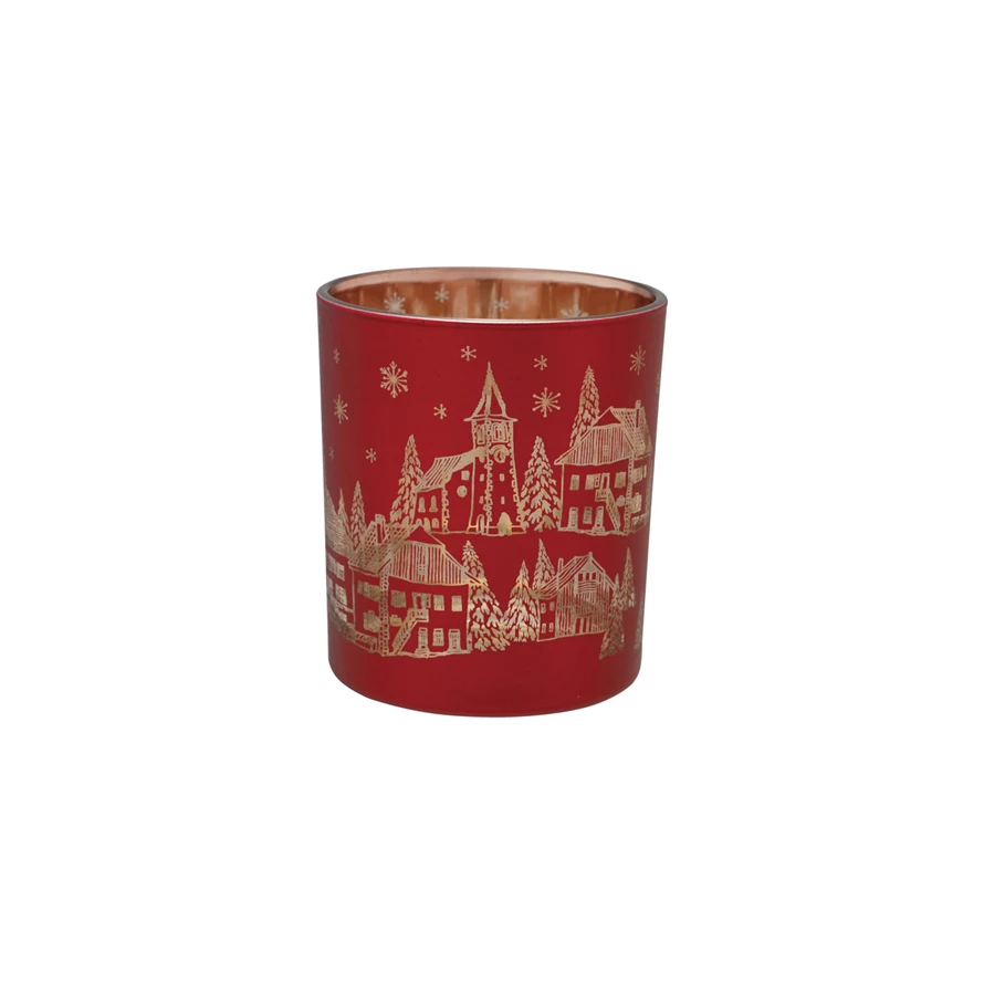 Glass Tealight/Votive Holder with Laser Etched Scene, Red & Gold Finish