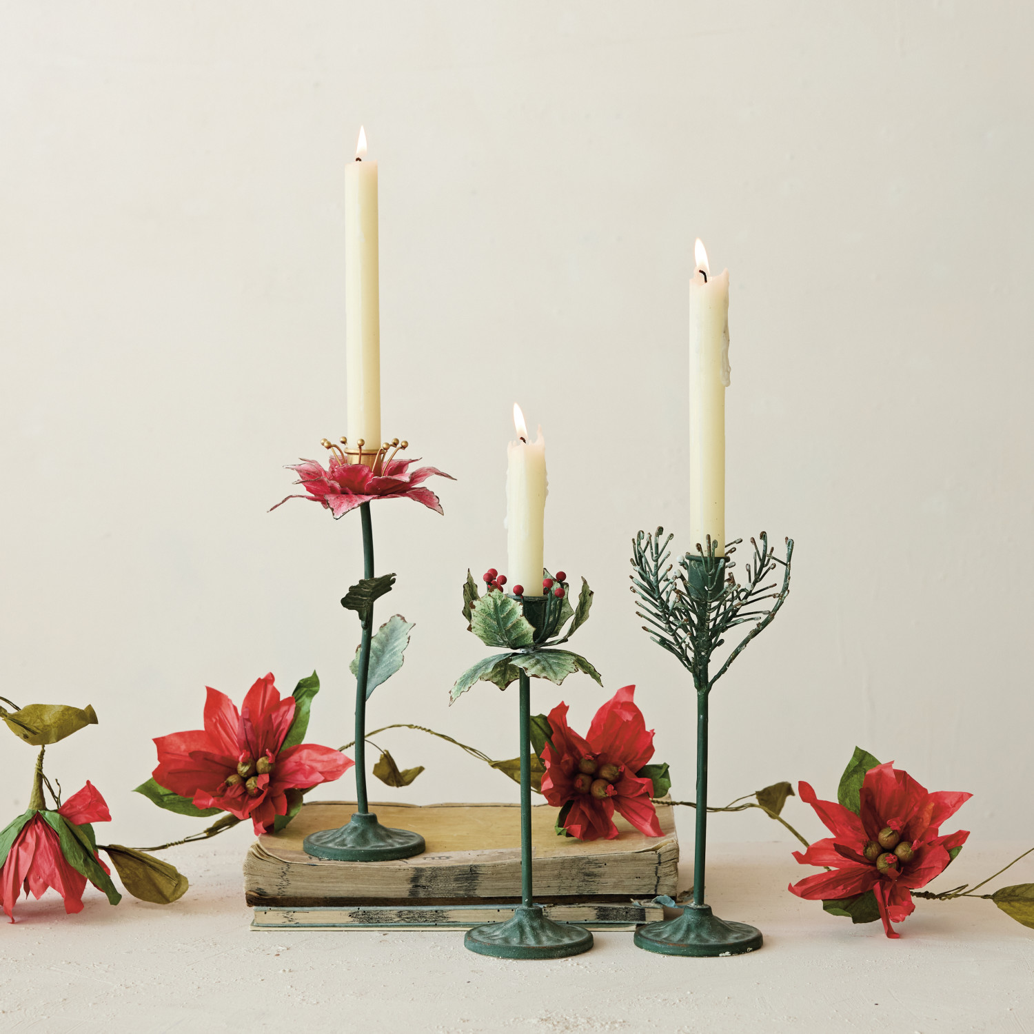 Painted Metal Poinsettia Shaped Taper Holder, Gold Color, Green & Red