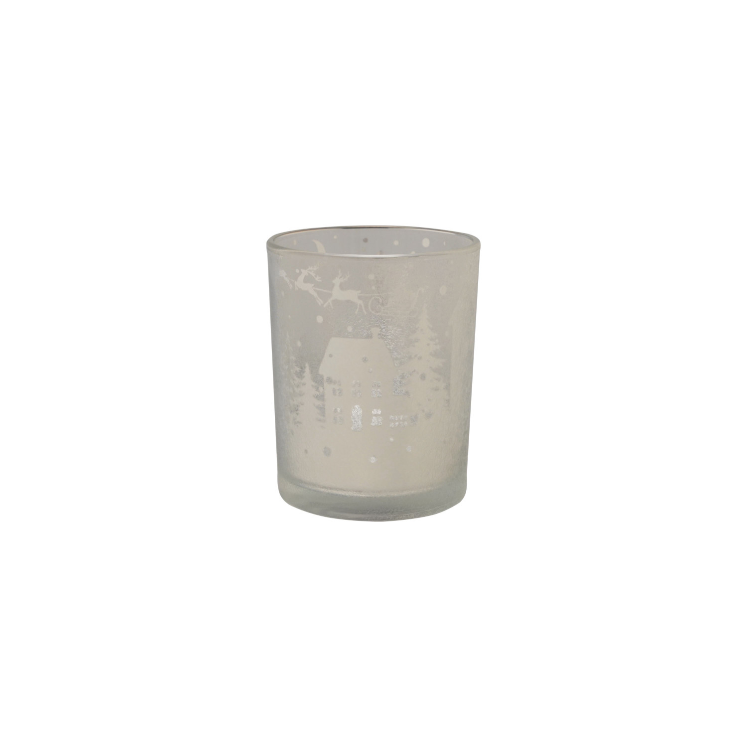 Catalog Name: 4" Round x 4-3/4"H Mercury Glass Tealight/Votive Holder w/ Laser Etched Scene, Silver Finish