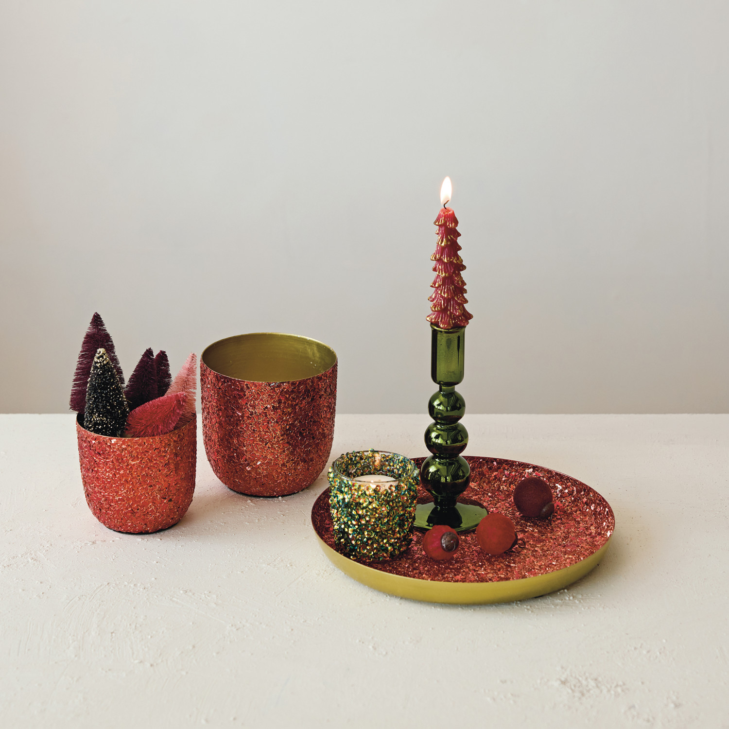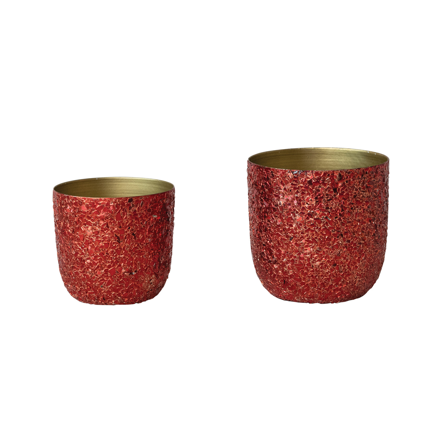 Catalog Name: 4-3/4" Round x 4-3/4"H & 4" Round x 3-3/4"H Metal Planters w/ Mica Flakes, Red & Gold Finish, Set of 2 (Holds 4" & 3" Pots)