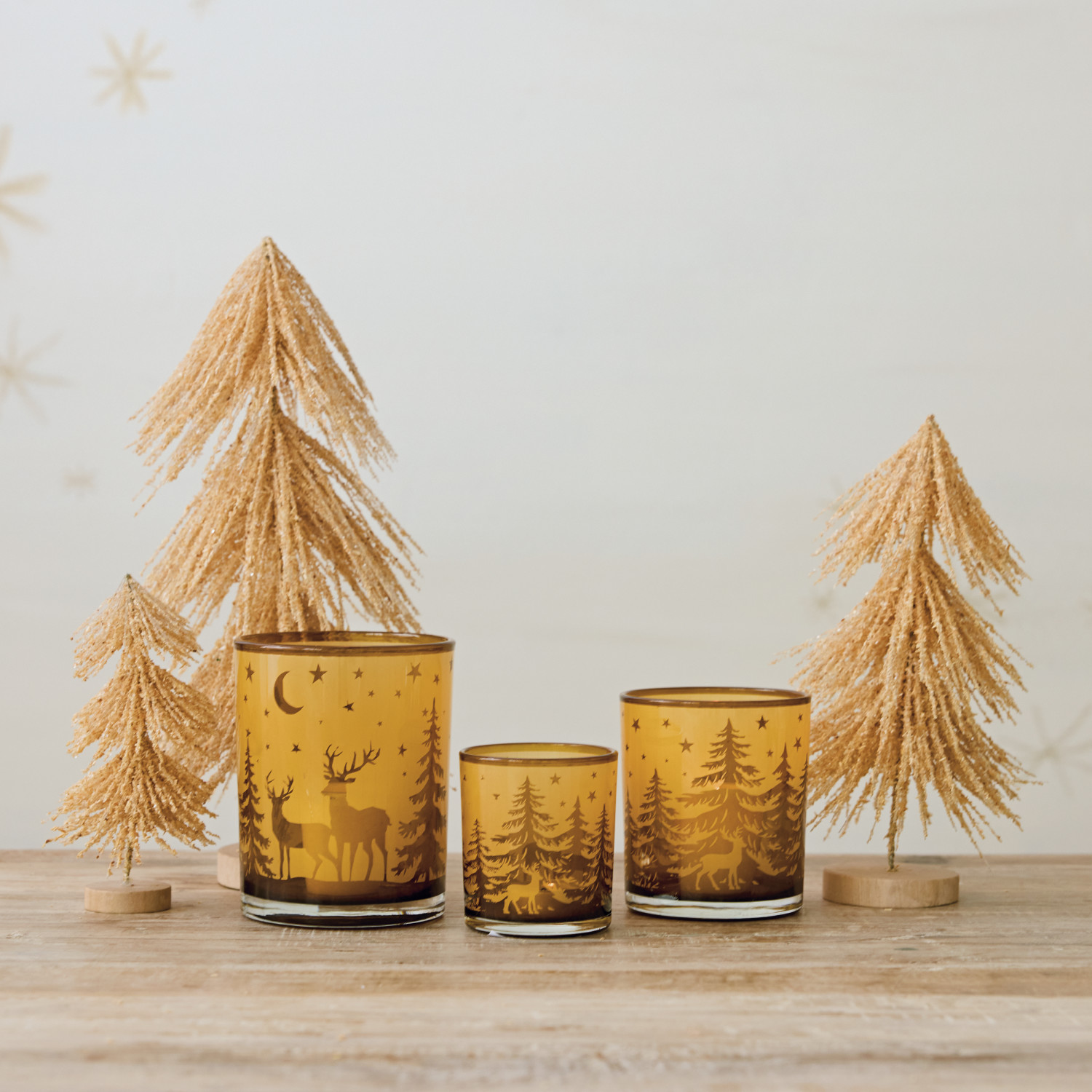Glass Tealight/Votive Holder with Laser Etched Deer & Trees, Amber Color