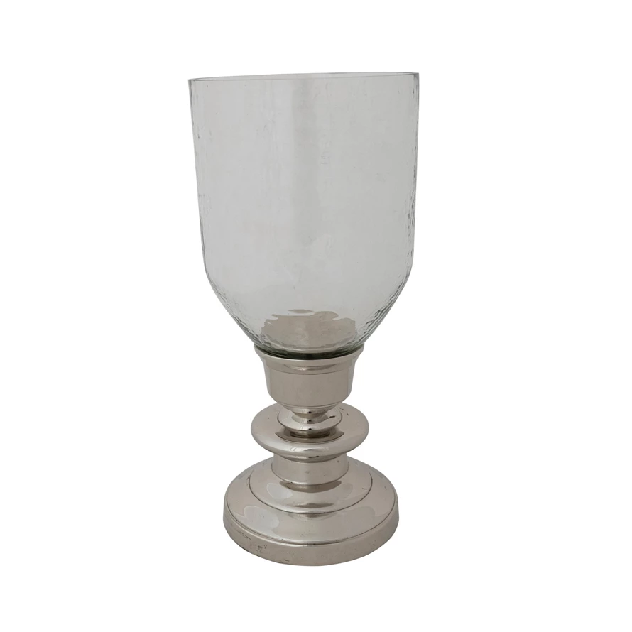 Catalog Name: 6-1/4" Round x 14"H Glass Hurricane w/ Cast Aluminum Base, Nickel Finish, KD (Holds 2-1/2" Pillar)