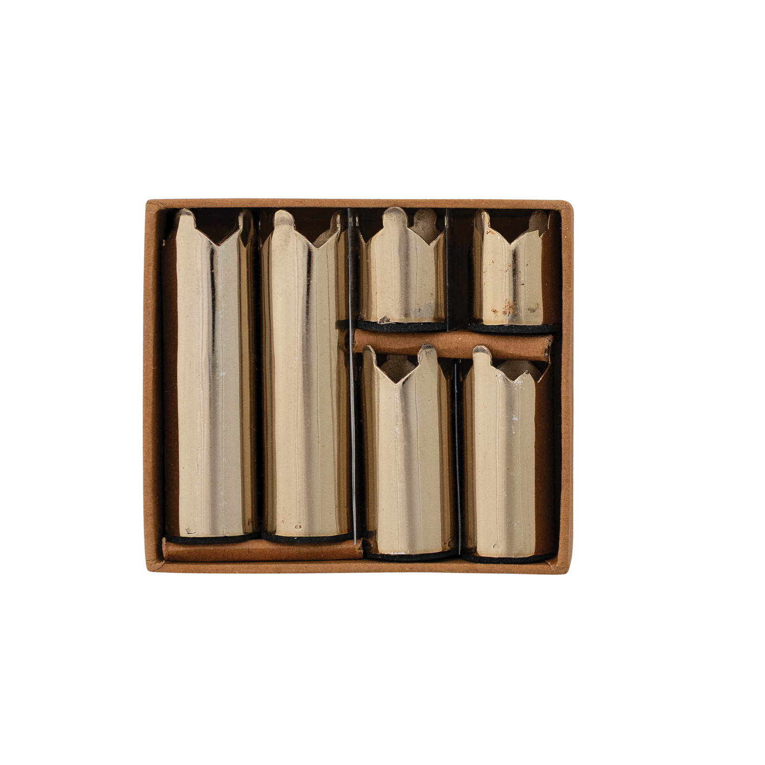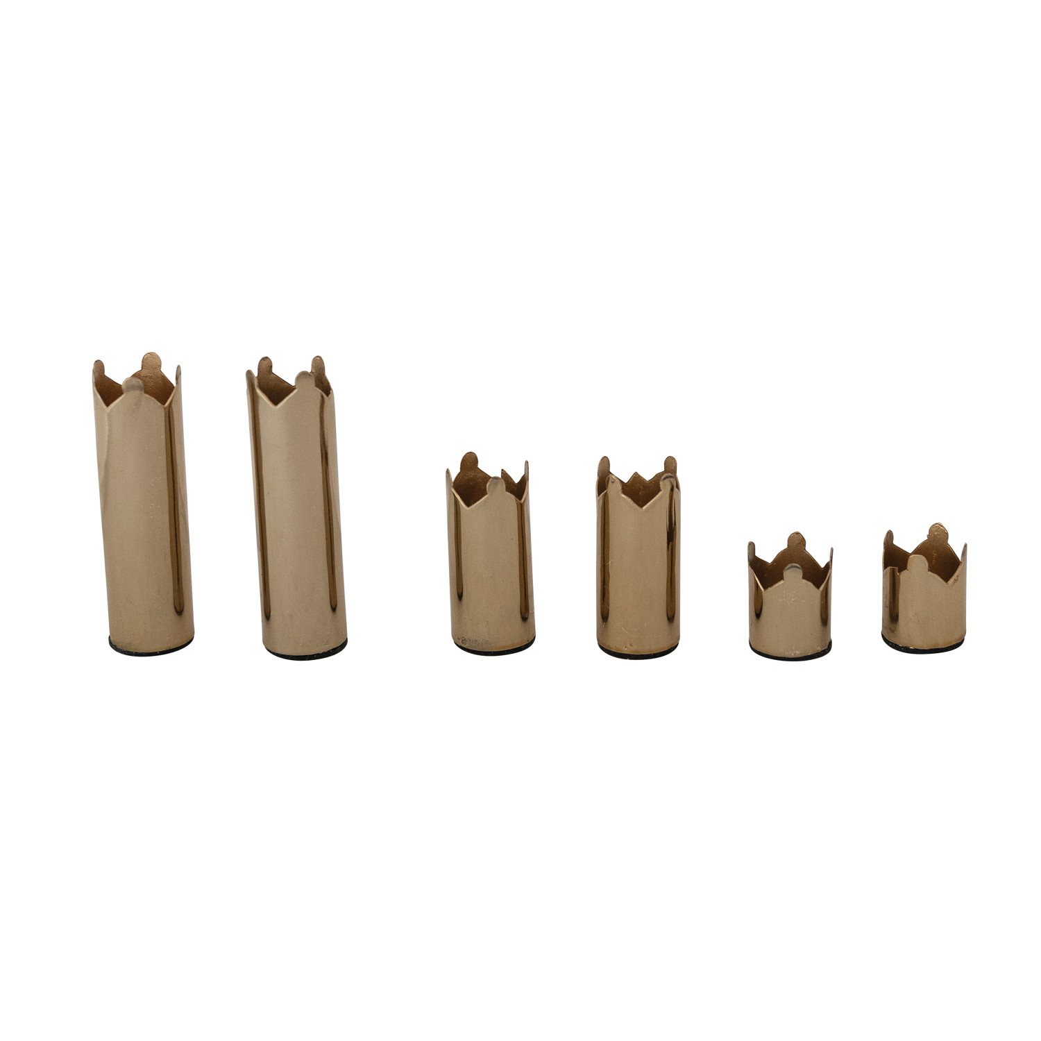 Catalog Name: (2) 3"H, (2) 2"H & (2) 1-1/4"H Metal Magnetic Crown Shaped Taper Holders, Gold Finish, Boxed Set of 6