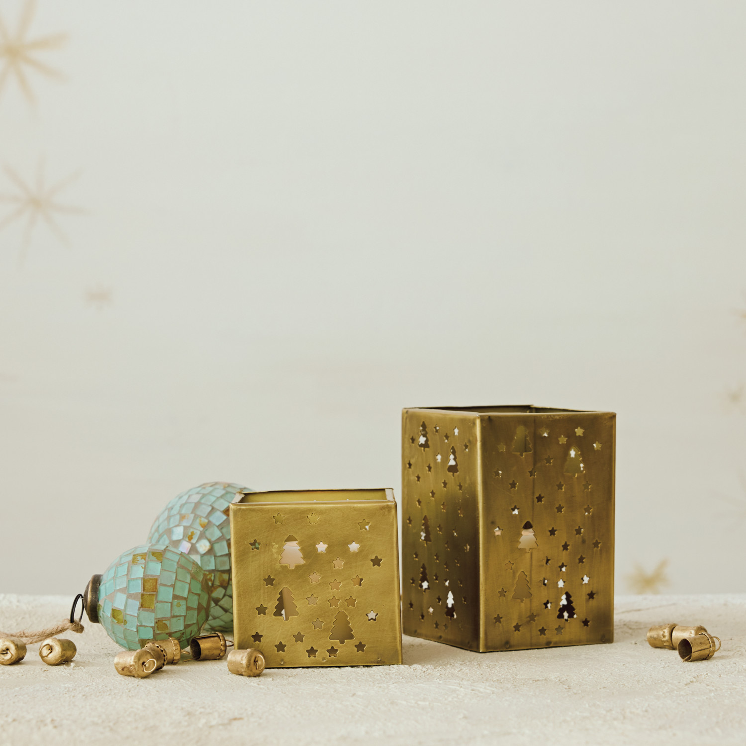 Catalog Name: 3-1/4" Square x 4-3/4"H Metal Tealight/Votive Holder w/ Trees & Stars Cut-Outs, Gold Finish