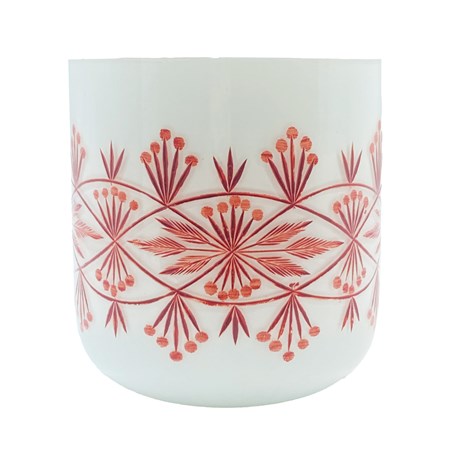 Catalog Name: 4" Round x 6"H Hand-Blown Etched Glass Footed Tealight/Votive Holder w/ Design, Iridescent & Gold Finish
