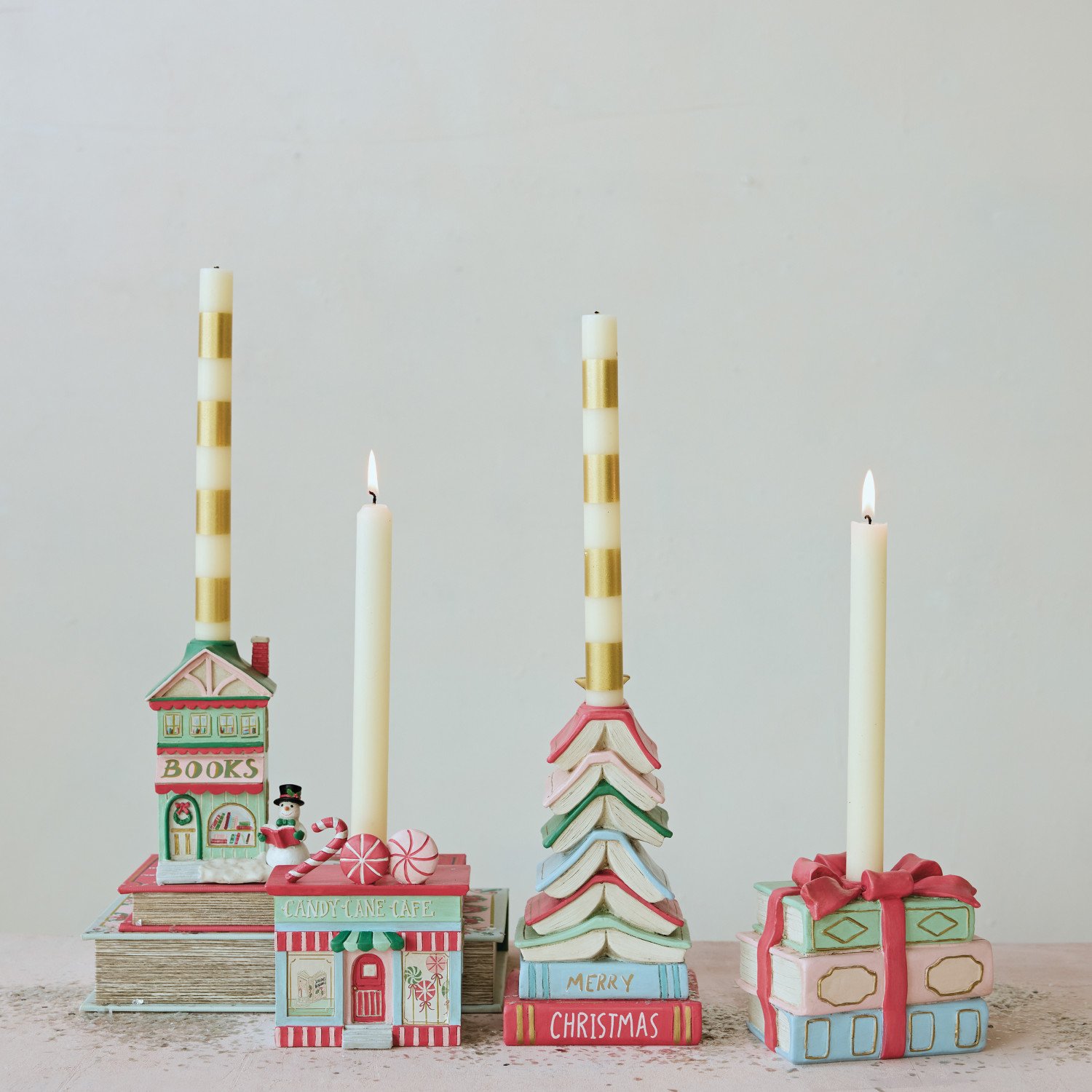 Resin Stacked Book Tree Shaped Taper Holder with Star "Merry Christmas" ©