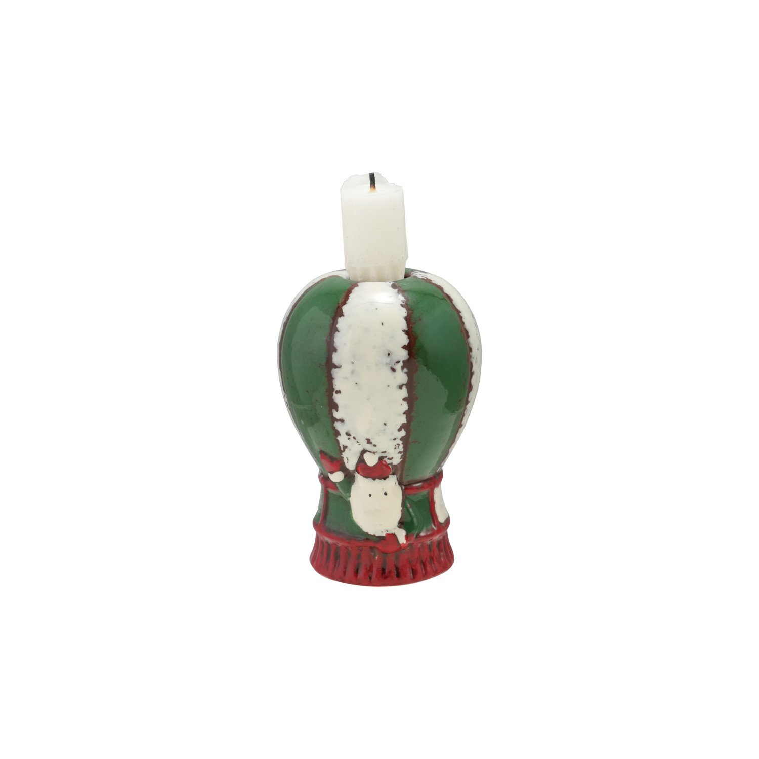 Catalog Name: 2-3/4" Round x 4"H Hand-Painted Ceramic Hot Air Balloon Shaped Taper Holder w/ Santa, Reactive Glaze, Green, White & Red (Each One Will Vary)